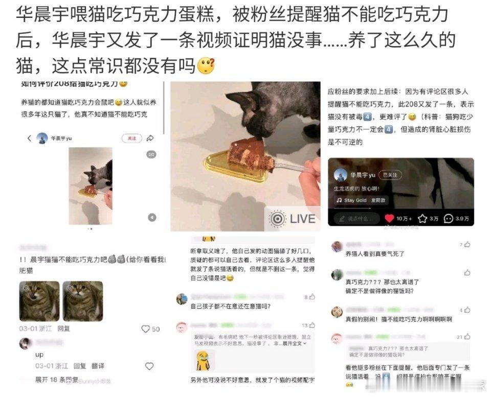 华晨宇喂猫吃巧克力蛋糕首先他没有喂,是猫自己好奇过来不小心舔了一口。后来华晨宇也发了猫的视频,猫没有问题,依旧生龙活虎,但凡了解华晨宇跟per感情的,都不会说出这种话。
