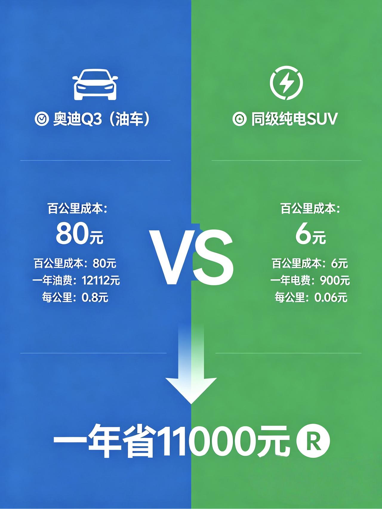 买车时觉得油车开着爽,加油方便不用等。开了一年Q3后,我认认真真算了一笔账——如果当初买了同级别纯电SUV,这一年到底能省多少钱?结果让我有点emo。 --- 🚗 我的奥迪Q3 真实能耗成本 先交代背景:2.0T,市区通勤为主,偶尔跑高速,一年开1.5万公里。 · 百公里真实油耗:9.5L-10L(别信表显,那是快乐表) · 燃油标号:95号汽油 · 当前油价:约8.5元/升 算笔细账: · 每公里油费 = 9.5L ÷ 100 × 8.5元 ≈ 0.8元 · 一年油费 = 15000公里 × 0.8元 = 12,000元 每月光油钱就1000块起步,加油加到我心疼。 --- 🔋 如果换成同级纯电SUV 拿比亚迪宋PLUS EV、小鹏G6这类车对比,同样一年跑1.5万公里: · 百公里电耗:约18-20度 · 充电方式:家用充电桩(大部分车主都有) · 家用电价:0.3元/度(夜间谷电更便宜,可以做到0.2-0.25元) 算笔细账: · 每公里电费 = 20度 ÷ 100 × 0.3元 ≈ 0.06元 · 一年电费 = 15000公里 × 0.06元 = 900元 就算全部在外面快充(1.2-1.8元/度),一年电费也就3000-4000元,仍然比油车便宜一大截。 --- 💰 一年能耗费用对比 车型 百公里成本 每公里成本 一年1.5万公里 奥迪Q3(油车) 约80元 0.8元 12,000元 同级纯电SUV 约6元 0.06元 900元 一年能耗差距:11,100元 开五年,油费就多花5.5万。这钱够买一部华为三折叠,或者每年带家人出去旅游一趟。 --- ⚡ 那混动车呢? 如果你还是担心纯电跑长途有焦虑,那插混(比如比亚迪宋PLUS DM-i)是个折中选项: · 市区用电:百公里电耗约18度,成本6元,和纯电差不多 · 长途用油:亏电油耗约5L/百公里,成本42.5元,比Q3省一半 一年1.5万公里,假设1万公里用电、5000公里用油: · 电费:10000 ÷ 100 × 18度 × 0.3元 = 540元 · 油费:5000 ÷ 100 × 5L × 8.5元 = 2125元 · 合计:2665元/年 比Q3省9300元,比纯电多花不到2000块,但完全没有里程焦虑。 --- 💡 我的真实感受 Q3开着确实爽,底盘扎实、高速稳、品牌也有面子。但每次去加油站,看着跳表从200跳到300再到400,心里都在滴血。 如果让我重新选,我会认真考虑混动。既能享受电车的低成本,又不用担心里程焦虑。至于纯电,家里有充电桩的话完全可以冲,一年省1万多太香了。 一点小建议:如果你每年开不到1万公里,油车和电车的差距没那么大,选自己喜欢的就好。但如果每年开2万公里以上,闭眼入电车或混动,两年省的油钱就够把差价赚回来了。 你的车一年能耗花多少钱?评论区晒出来比比!【来自懂车帝车友圈】