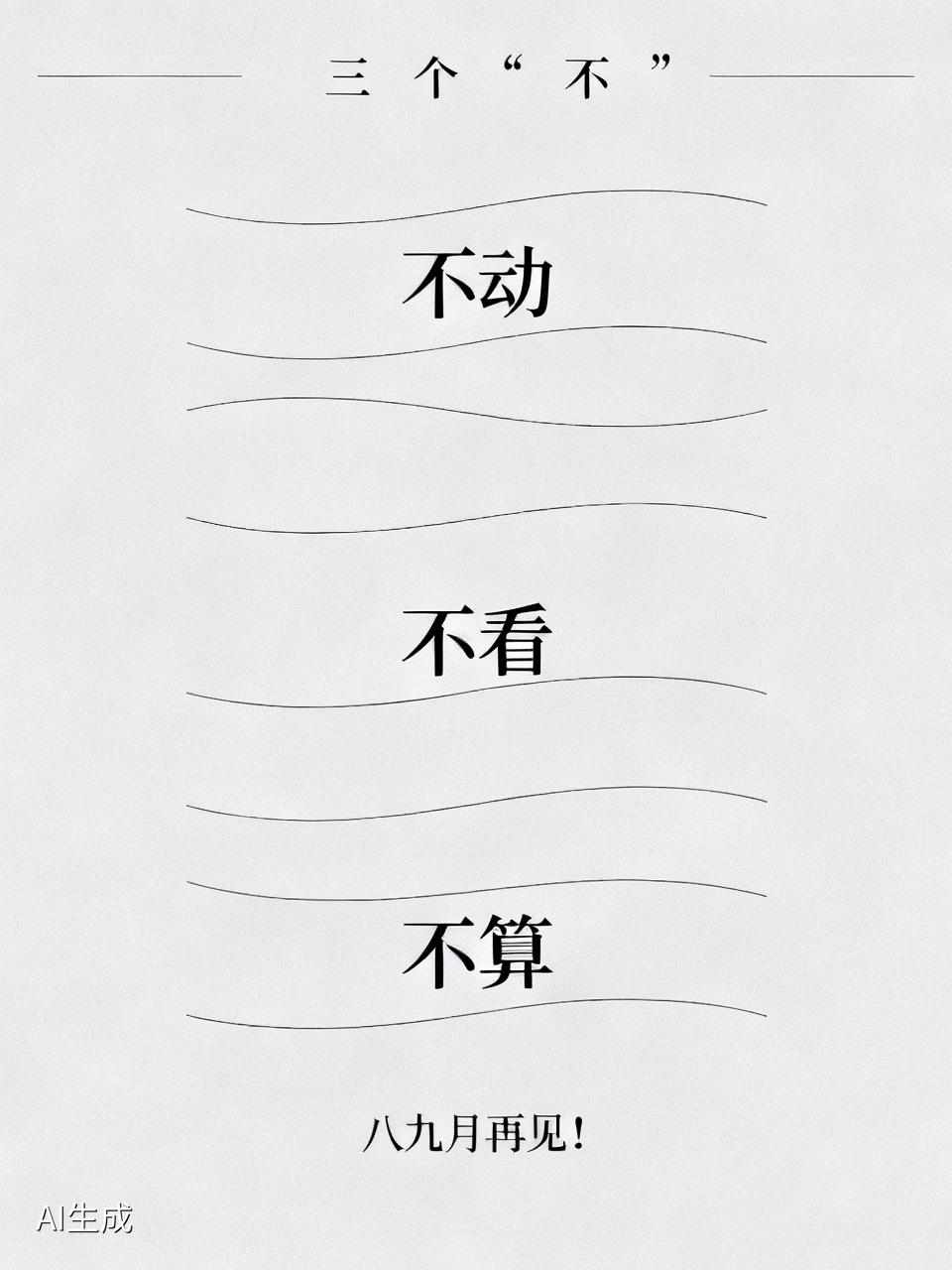 股友们,你的股票涨了吗? 涨了? 恭喜发财! 跌了? 是割?是补? 想不当韭菜怎么办? 就看你能不能与庄家战斗到底? 怎么斗? 三个“不” 不动,不看,不算(计算亏多少) 八九月再见!