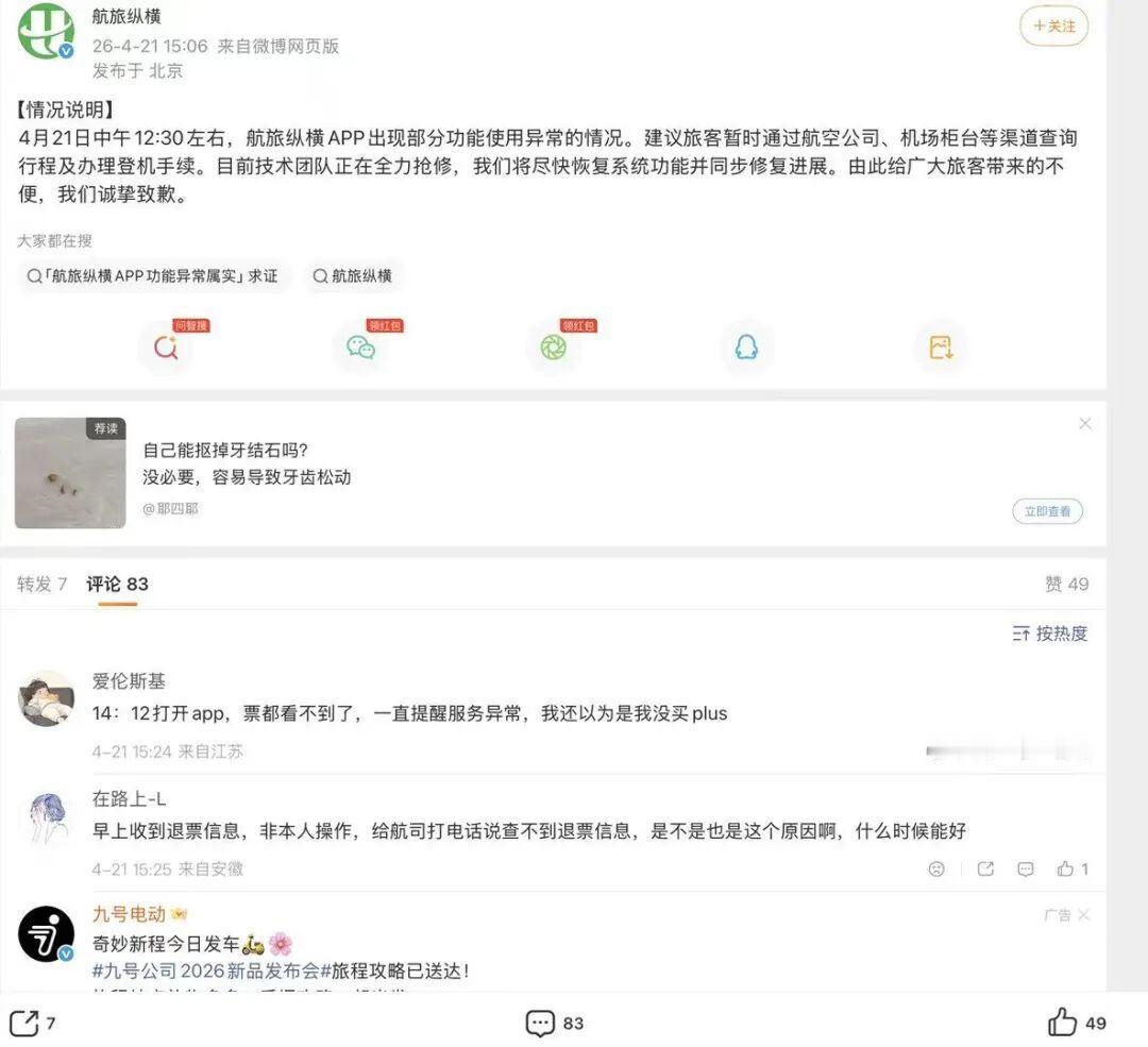 航旅纵横又“崩”上热搜了! 近日,这个坐拥上亿用户的APP突发大面积瘫痪,行程消失、登机牌刷不出,大量旅客出行受阻,太耽误事了。这已不是它第一次“掉链子”,去年就曾误发航班取消通知。事发后平台紧急致歉抢修,但“官方直销平台”的雄心,看来还得先过“系统稳定”这一关。
