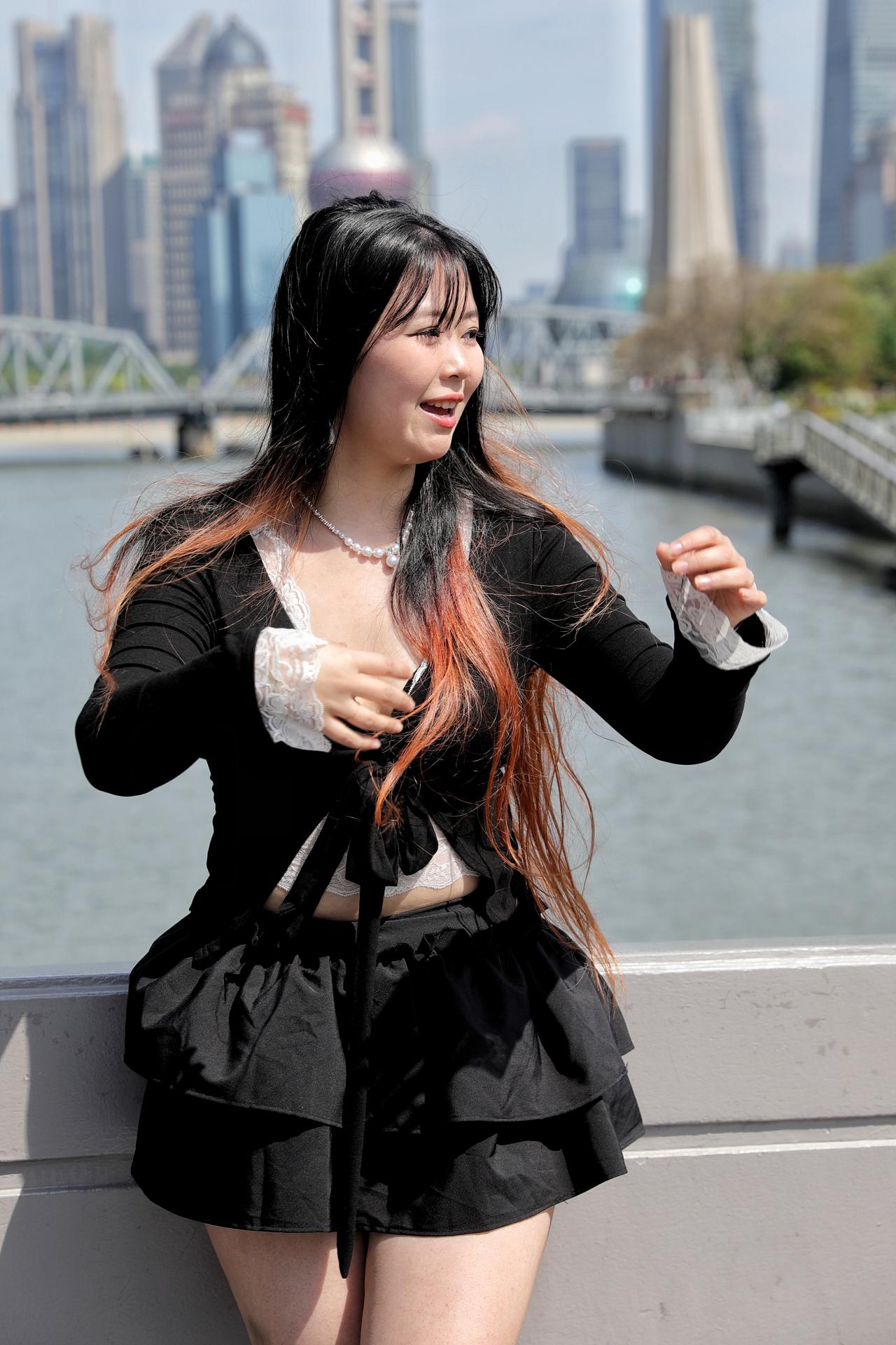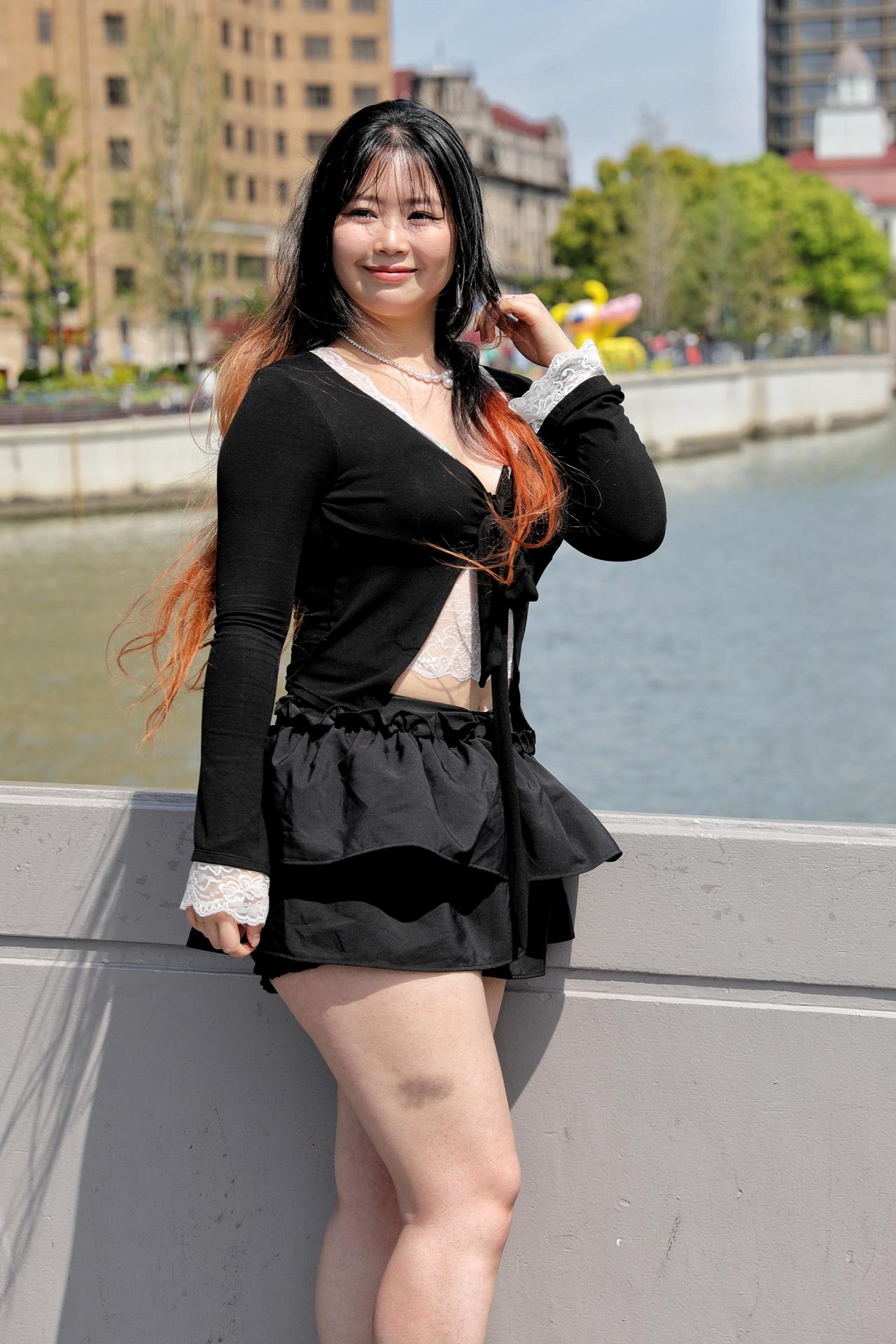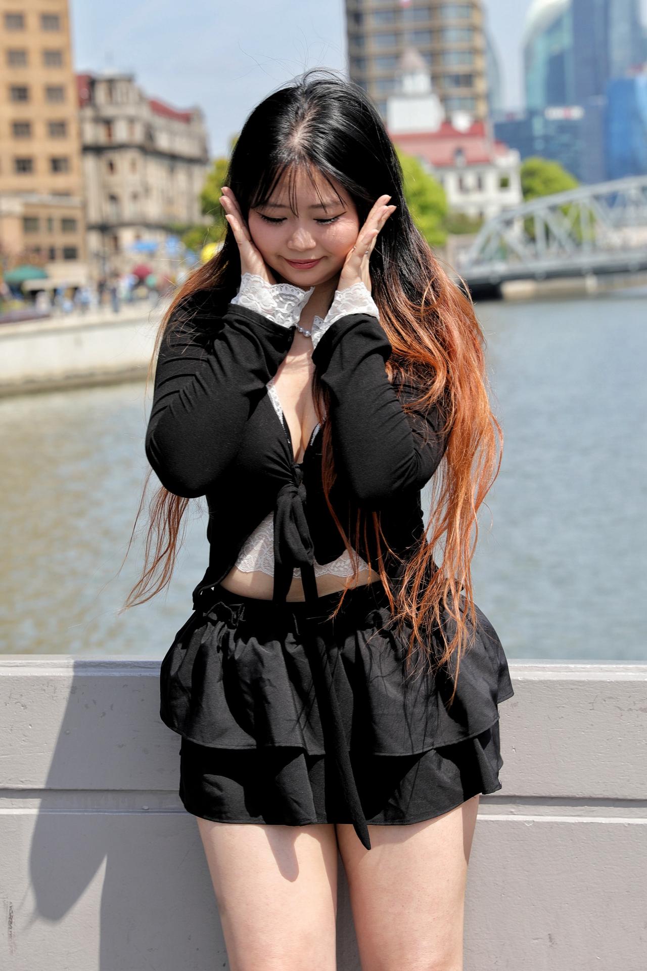 《河畔风与橙红发梢》 苏州河畔的风裹着春日的暖意,轻拂过她的发梢,几缕橙红挑染在黑长发间漾出灵动的光。她身着蕾丝镶边的黑系套装,低领上衣缀着柔白蕾丝,搭配层叠的蛋糕短裙,颈间的珍珠项链添了几分精致。倚着栏杆浅笑,背景是波光粼粼的河面与对岸的城市轮廓,复古的红砖建筑与铁桥勾勒出老上海的韵味。阳光落在她身上,将少女的明媚与都市的温柔揉成一幅鲜活的画面。