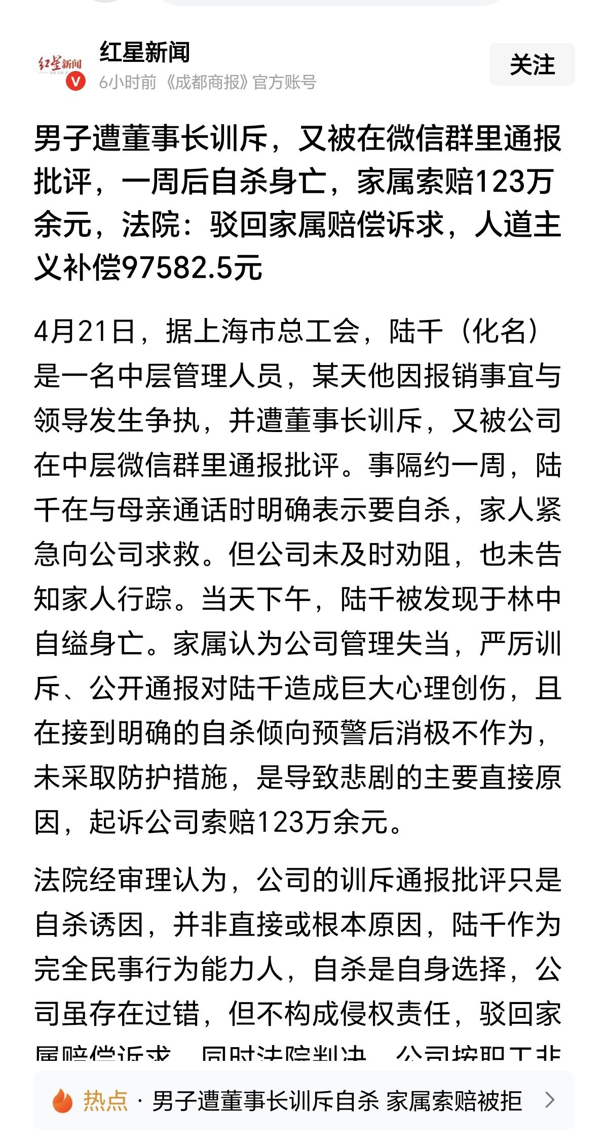 就因为报销这么点小事, 就跟董事长撕破脸,这小伙子明显职场情商不在线啊!后面因为群里被通报批评就自杀,只能说明他自己的心理问题更大。 这家公司待不了,大不了就不干了,没必要要死要活的。 我前公司的老板,也是个爱骂人的董事长。多少中层员工被他扯着嗓子,当着全公司的人指着鼻子骂,而且还是个妥妥的大男子主义,总是在公司宣扬“女人就该回家带孩子,不该出来抛头露面上班”。 要是公司里人人都那么脆弱,那走极端的人不要太多哟! 法院驳回家属的诉求合情合理合法!大家怎么看?