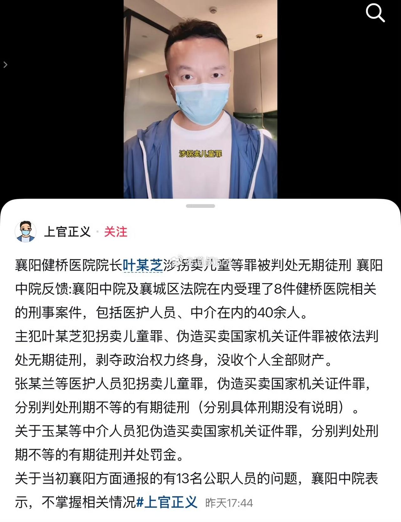 4 月 21 日,一起涉及全国的贩卖出生证、疫苗证、拐卖婴儿的特大犯罪团伙全部覆灭。湖北襄阳健桥医院院长叶有芝及医护人员 40 多人被判刑,其中院长叶有芝被判处无期徒刑,没收全部财产。 这起震惊全国的特大贩婴大案团伙的彻底覆灭,首先要归功于全国知名打拐正义人士、退伍老兵上官正义。2023年11月6日,他顶着巨大压力公开实名举报:湖北襄阳健桥医院院长叶有芝,长期勾结社会中介,大肆贩卖出生医学证明、疫苗接种本,并且直接参与拐卖婴儿,同时发布大量暗访取证视频。 举报一经曝光,瞬间引爆全网,举国震惊。谁也无法想象,一位堂堂正规医院的院长,身披白衣、手握行医资格,背地里却干着伤天害理、泯灭人性的罪恶勾当。 举报发出后,襄阳警方雷霆出击,迅速介入调查。2023年11月12日,叶有芝被依法批准逮捕,由此,这家民营医院隐藏多年的黑色产业链与重重黑幕被彻底揭开。 主犯叶有芝,湖北襄阳本地人。1990年毕业于湖北郧阳医学院,毕业后进入襄阳102医院妇产科工作。该院原为湖北省工业建筑集团职工医院。叶有芝在此深耕13年,从一名普通医生一路晋升为妇产科主任。 2003年,医院启动改制,眼光毒辣的叶有芝率先承包医院妇产科,实行独立运营、自负盈亏。 由于地方小型医院竞争力薄弱,客源稀少,常规医疗业务难以盈利。2009年,叶有芝脱离公立医院体系,私自开设私人门诊,购置移动式B超设备,盯上非法胎儿性别鉴定灰色产业,同时秘密开展非法人流手术,靠违法操作疯狂敛财。 好景不长,很快她的罪行被群众举报。2010年,叶有芝因非法节育犯罪被判处拘役五个月。 极具讽刺的是,案发后她的医师执业资格并未被吊销,监管的漏洞,为她日后卷土重来、犯下更大罪恶埋下了致命隐患。 2011年,原102医院全面改制,叶有芝借机入局,出资700万成为最大股东,将医院更名为襄阳健桥医院,主营妇科、产科、儿科,正式成为医院实际控制人与法人代表。 成为院长和老板后,市场竞争压力巨大,正规医疗经营举步维艰。利欲熏心的叶有芝彻底抛弃医者仁心,走上违法犯罪的不归路。 当时,大量非法代孕、私自抱养、被拐卖的婴儿,因没有合法手续无法落户。叶有芝看准这个黑色需求,利用医院合法资质大开方便之门:伪造全套产检档案、住院记录、分娩病历,出具全国通用、具备法律效力的真实出生证明与疫苗本,帮助来历不明的孩子洗白身份、合规落户。 整套手续收费9.6万元,叶有芝单人净得6万元,余款分给中介与内部涉案人员,这也成为健桥医院最核心的暴利黑产。 不止买卖证件,她还深度参与婴儿收购与贩卖,跨省勾结中介,构建起覆盖全国多省市的贩婴网络,借此牟取巨额暴利。 多年来,她披着白衣天使的外衣,顶着企业家、行业精英的光环,一边享受荣誉,一边持续作恶。 2022年,叶有芝甚至被评选为襄阳最美巾帼奋斗者,光鲜的荣誉之下,全是沾满鲜血的罪恶交易。 纸终究包不住火,2023年,在打拐勇士上官正义的坚持不懈卧底取证与实名举报下,这个隐藏多年的恶魔终于落马。 2026年4月21日,该案迎来最终宣判。以叶有芝为首,包含院内医护、中介人员共计40余人全部获刑。 主犯叶有芝,因拐卖儿童罪、伪造买卖国家机关证件罪数罪并罚,判处无期徒刑,没收个人全部财产。至此,这起全国关注、性质极端恶劣的特大犯罪团伙,彻底覆灭。 天网恢恢,疏而不漏。践踏人伦、践踏法律的白衣恶魔,最终被正义牢牢锁住,得到最公正、最严厉的惩罚。