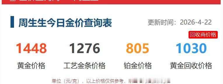 作为对价格最为 敏感的周生生 这个黄金品牌, 再度进行了黄金销售价格调整。 4月22日, 周生生的黄金价格为1448元, 比昨日价格低了21元; 工艺金条价格为1276元, 比昨日价格低了9元; 铂金的价格为805元, 比昨日价格低了6元; 黄金的回收价格为1030元。