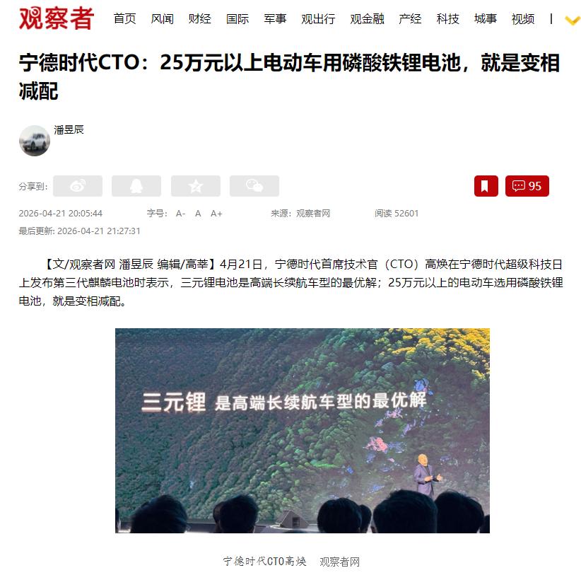 宁德时代CTO说实话:25万以上电动车用磷酸铁锂,就是偷工减配 4月21日,宁德时代开了场超级科技日,首席技术官高焕直接放狠话:25万元以上的电动车,要是用磷酸铁锂电池,那就是变相偷工减配。这话有人听着懵,也有人说宁德时代自卖自夸——毕竟他们家三元锂电池做得好。 先把话说死,高焕不是随口乱喷,他说这话的时候,刚好发布了第三代麒麟电池,核心就是想告诉大家:高端电动车就得配好电池,三元锂电池才是高端长续航车型的最好选择。 花25万以上买电动车,谁不是图个省心、续航稳、好用?车企要是为了省钱,用磷酸铁锂电池,看着没减配置,其实是悄悄拉低了车的核心实力,这就是他说的“变相减配”,一点不夸张。 要搞懂这话,不用记专业术语,就搞明白俩电池的区别——磷酸铁锂电池和三元锂电池,实际用起来到底不一样在哪。 先说说磷酸铁锂电池,它就一个优点:便宜、安全。同等容量,比三元锂电池便宜不少,车企用它能省一大笔钱。 而且不容易起火爆炸,撞了也相对安全。但缺点太致命,尤其是对买高端车的人来说,全是硬伤。 第一,续航不行。同样大小的电池包,三元锂电池装的电更多,跑的更远。买25万以上电动车的人,要么家用要么跑长途,没人愿意天天充电。磷酸铁锂电池想追上三元锂的续航,就得把电池包做得更大更重,车的空间被占,开着也笨重,得不偿失。 第二,低温性能差。北方朋友都懂,冬天电动车续航会“缩水”,磷酸铁锂电池缩得更厉害,零下几度,续航能少一半,本来能跑500公里,冬天只能跑300多,跑长途很容易半路没电,太闹心。高端车卖遍全国,总不能只给南方人用吧?这就是硬伤。 而三元锂电池,刚好能补上这些窟窿。续航强、低温性能好,冬天缩水少,充电还快,高端车用户看重效率,这一点太重要。 高焕敢说这话,也因为宁德时代的技术硬,刚发布的第三代麒麟电池,续航能破1000公里,充电10分钟能跑400公里,完全够高端车使。 有人会抬杠,磷酸铁锂电池就不好吗?不是不好,它适合便宜的代步车,10万、15万的车,预算有限,图个安全便宜,用它刚好。 但25万以上的高端车,还在用这种性价比电池,就是拿便宜货卖高价,不是减配是什么? 市面上不少25万以上的电动车,偷偷用磷酸铁锂电池,说白了就是车企想省钱。市场竞争凶,利润薄,用便宜电池能多赚点,还故意拿“安全”忽悠人,掩盖续航差的短板。 最后提醒大家,买25万以上的电动车,别光看外观内饰,一定要看电池类型。三元锂电池虽然贵一点,但续航、低温性能都强,长期用更省心。 高焕这话,既是对自家技术有信心,也是提醒咱别花了高端车的钱,买了个“缩水版”电池,被车企坑了还蒙在鼓里。