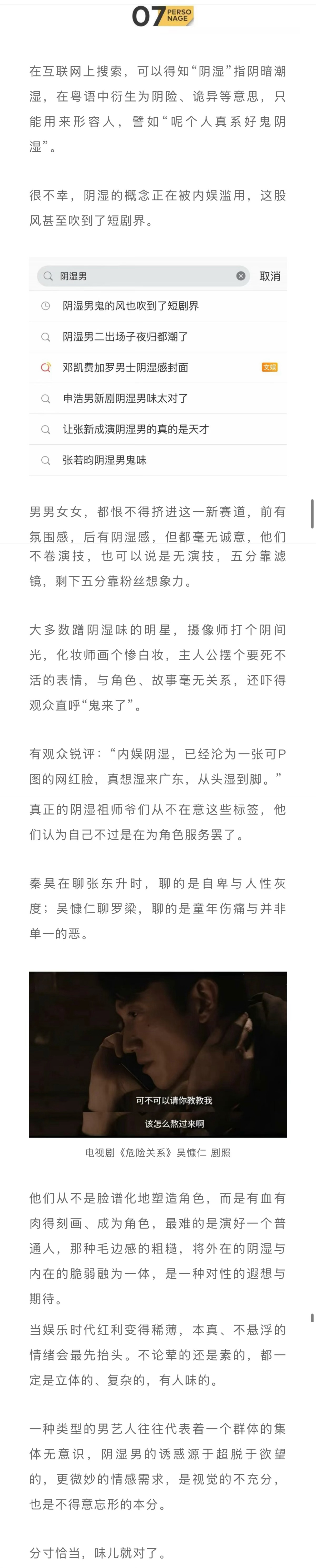 在刚播完的《危险关系》中,吴慷仁变为一个在亲密关系中操控情感的施暴者,从温和的眼神中往底下看,是深不见底的阴暗、可怖。