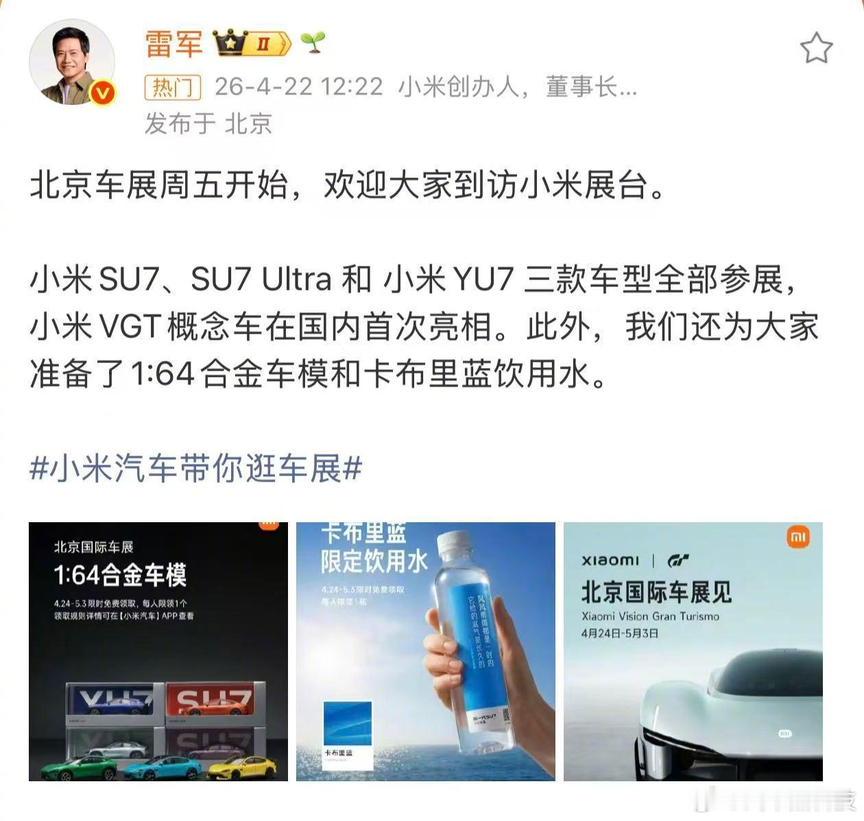 【北京车展每人都能领个小米车模】4月22日,小米汽车总裁雷军发博为小米汽车展台预热,并表示为大家准备了小米车模和瓶装水。