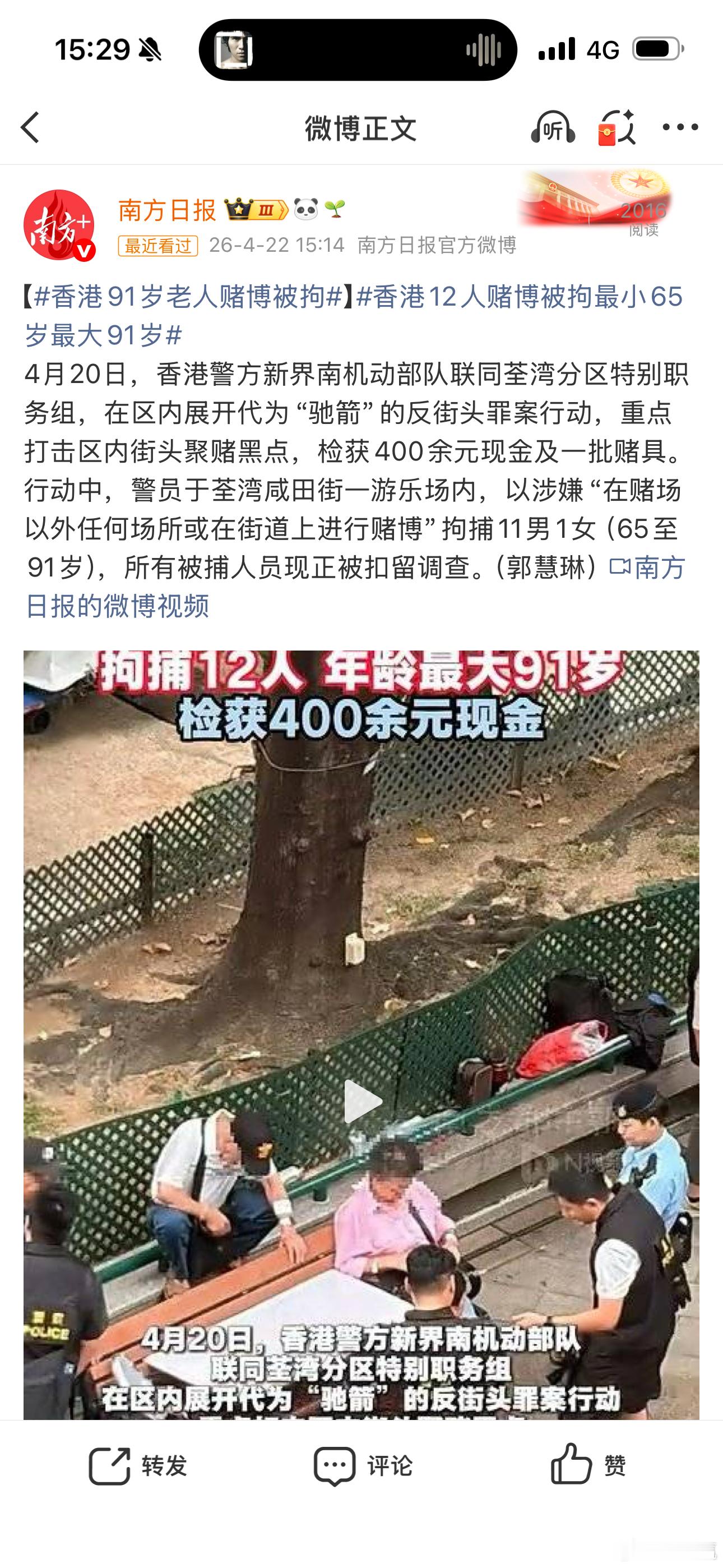 香港12人赌博被拘最小65岁最大91岁虽然香港警方这种不和稀泥的做事风格值得肯定,但是这12个老人就400元的赌资也算赌博吗?还给扣留了