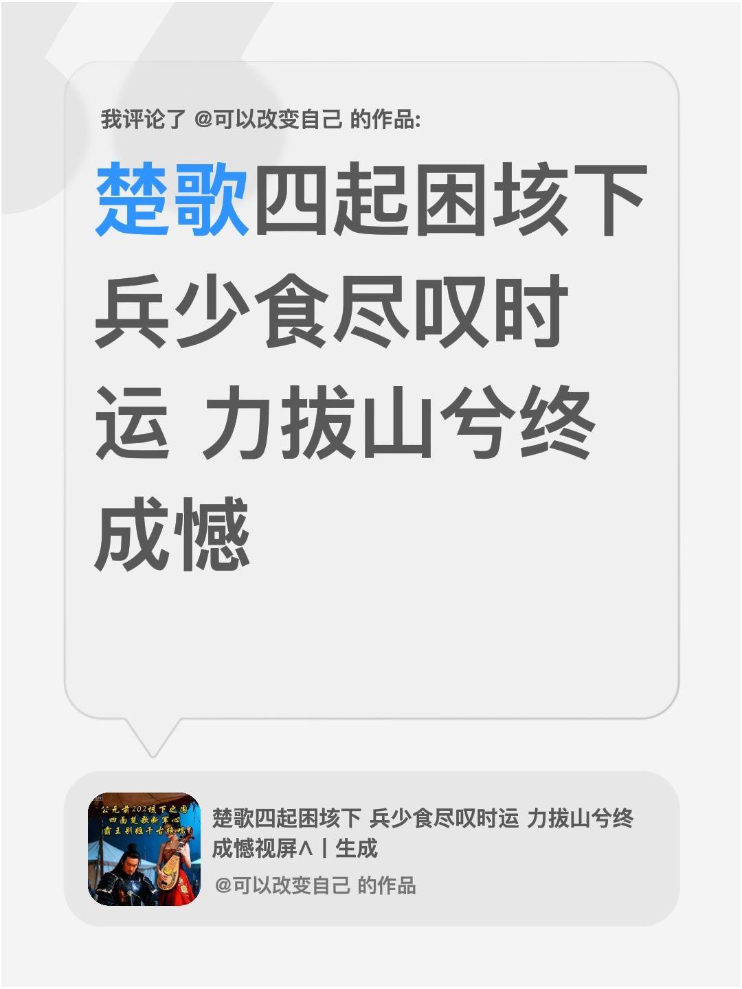 我评论了@可以改变自己 的作品: 楚歌四起困垓下 兵少食尽叹时运 力拔山兮终成憾