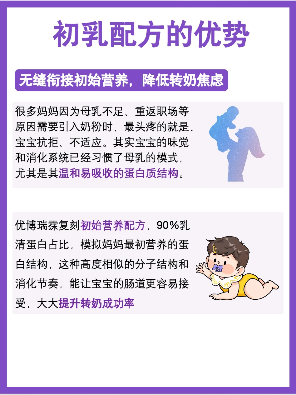 很多妈妈因母乳不足或重返职场需要引入奶粉时,最头疼的就是宝宝抗拒、不适应。优博瑞霂采用100%生鲜乳清,乳清蛋白占比高达90%,与妈妈最初营养的蛋白结构(90:10)一致💜这种高度相似的分子结构和消化节奏,能让宝宝肠道更容易接受,大大提高转奶成功率,减少不适。