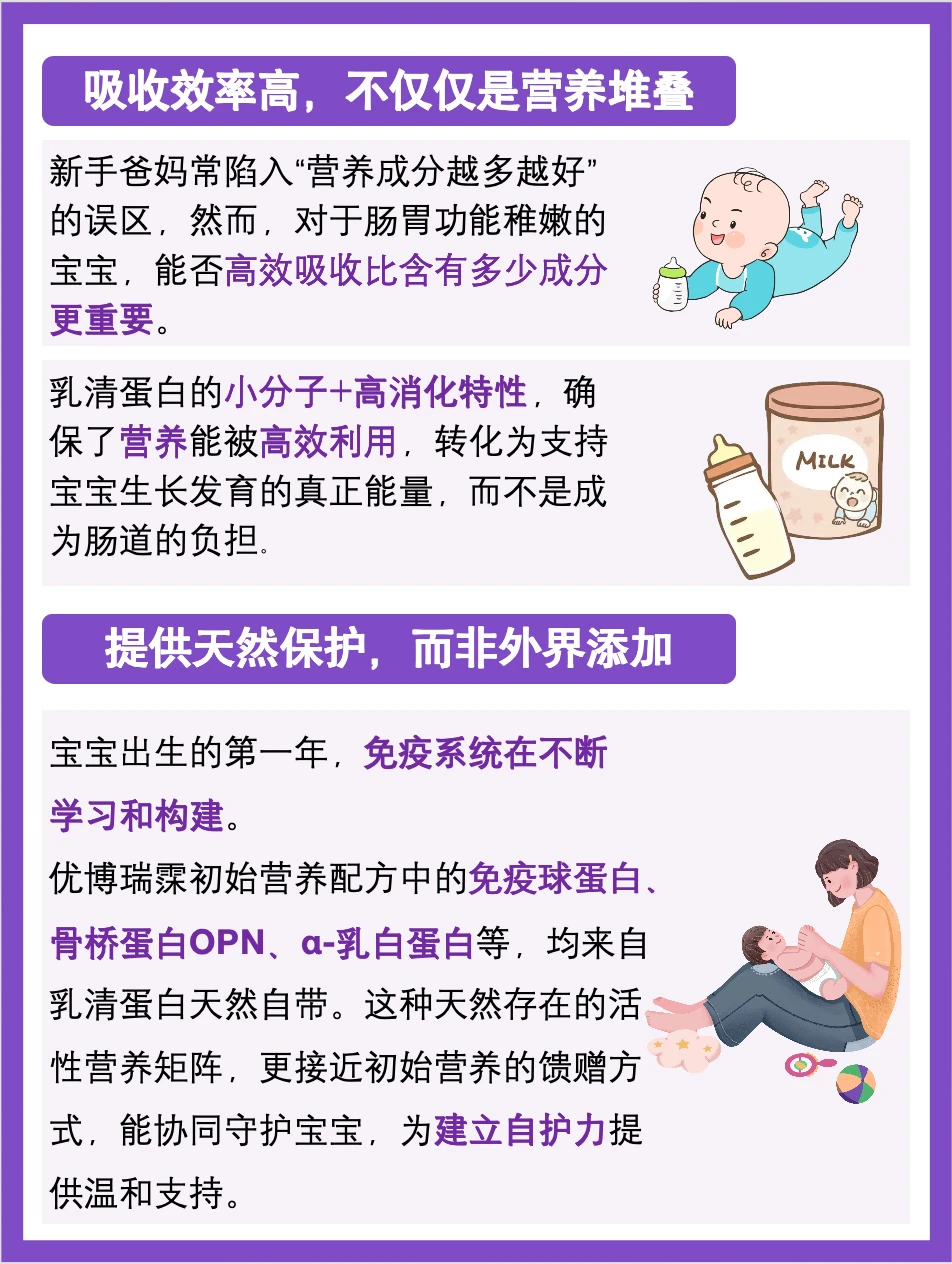 宝宝的第一年,免疫系统在不断学习和构建。[氛围感R]优博瑞霂初始营养配方中的免疫球蛋白、α-乳白蛋白、骨桥蛋白(OPN)等活性营养,均来自乳清蛋白天然自带,更接近初始营养的馈赠方式,协同守护宝宝,温和支持自护力🛡️