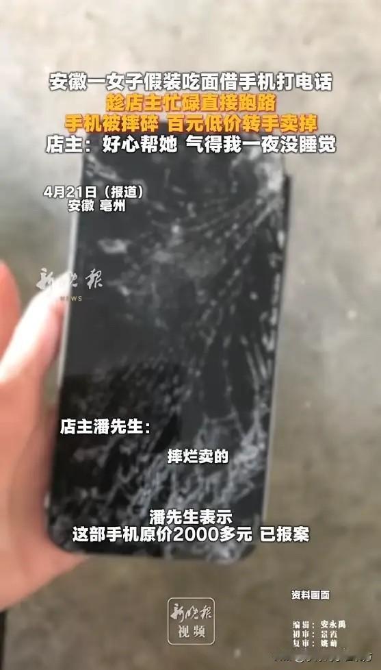 好心没好报!4月20日深夜,安徽亳州一名女子假装吃面,以借手机打电话为由骗走店主潘先生的手机,趁店主忙碌时拔腿就跑,还将手机摔烂后以100多元的价格卖掉。 4月20日23点左右,亳州利辛县的气温已经降下来,街边的店铺大多关了门,只有潘先生的小饭馆还亮着灯,准备打烊收尾。 就在这时,一名年轻女子走进了饭馆,她大概20岁出头,染着黄色头发,穿着随意,看起来和普通食客没什么两样。 潘先生以为是晚来的顾客,连忙迎上去,笑着问她想吃点什么,女子没有过多犹豫,直接说要一碗面,还找了个靠近门口的位置坐下,看起来很放松的样子。 潘先生转身回到后厨煮面,心里没多想,只觉得是个普通客人。没过多久,女子突然起身走到潘先生身边,脸上带着着急的神情,开口说:"老板,能不能借我手机用一下?我手机没电了,想给朋友打个电话,说下我到哪儿了?” 潘先生是个热心肠,平时遇到有需要帮忙的人,只要力所能及都会搭把手,他没怀疑女子有别的心思,立刻掏出自己的手机递过去,还主动解开了手机锁屏,告诉她号码可以自己按。 女子接过手机后,走到饭馆门口假装打电话,看起来神情很认真,还时不时对着手机说话,完全看不出有问题。 潘先生把手机借给女子后,继续在后厨忙活,没过多久,饭馆里又进来两位顾客,说是要打包两份面带走。 潘先生赶紧放下手里的活,忙着给新顾客下面、打包,完全没顾上门口的女子。 可就在这短短一两分钟里,意外发生了,等潘先生把打包好的面递给新顾客,一抬头看向门口,瞬间愣住了,刚才还在打电话的女子不见了,放在门口的手机也没了踪影。 潘先生瞬间慌了神,反复回想刚才的细节,越想越不对劲,他仔细回忆,女子接过手机后,虽然一直在对着手机说话,但根本没有真正拨出号码,手机上也没有任何通话记录,从头到尾都是在演戏。原来自己的好心,早就被人当成了可乘之机。 潘先生又急又气,立刻在饭馆周边四处寻找,一边找一边喊着女子的名字,可始终没有任何回应。 他不甘心,又沿着街道附近的手机店挨家打听,心里抱着一丝希望,说不定女子走投无路,会把手机卖掉。 果然,在附近一家二手手机店里,潘先生找到了自己的手机,可眼前的景象让他心疼又愤怒,原本完好的手机已经被摔得稀烂,屏幕碎裂、机身变形,完全没法再使用。 二手店老板告诉他,刚才一名女子拿着这部手机来卖,只卖了100多元,对方还说手机是自己坏的,急着处理掉。 潘先生看着被摔坏的手机,眼泪都快出来了,这部手机是他花2000多元新买的,平时用来联系生意、接订单,对他来说很重要。 没想到自己好心帮人,不仅没得到感谢,反而被骗走手机,还被糟蹋成这样,损失了近2000元。 目前,潘先生已经向警方提交了相关证据,包括饭馆的监控录像、二手手机店的购买记录等。 警方表示:将根据监控线索全力追查这名女子,一旦抓获,将依法追究其法律责任,按照法律规定,虽然女子只卖了100元,但涉案手机原价2000元,财物损失将按原价计算,她很可能涉嫌盗窃罪。 潘先生说,自己曝光这件事,不是为了博取同情,而是想提醒更多人,尤其是做小生意的同行,一定要小心这种骗局,不要像自己一样好心被骗,他希望通过自己的经历,让更多人提高警惕,避免再有人落入同样的陷阱。 截至目前,案件还在进一步调查中,警方尚未公布更多细节,但这起案件给我们敲响了警钟,在日常生活中,我们既要保持善良和热心,也要学会保护自己和财物,不要轻易相信陌生人的话,避免给骗子可乘之机。 最后,再次提醒大家,防人之心不可无,好心也要有分寸,遇到陌生人借手机、借钱等请求,一定要多留个心眼,必要时可以拒绝,不要因为一时心软而遭受损失。 同时,也希望警方能尽快破案,帮潘先生挽回损失,也让骗子得到应有的惩罚,维护良好的社会秩序。