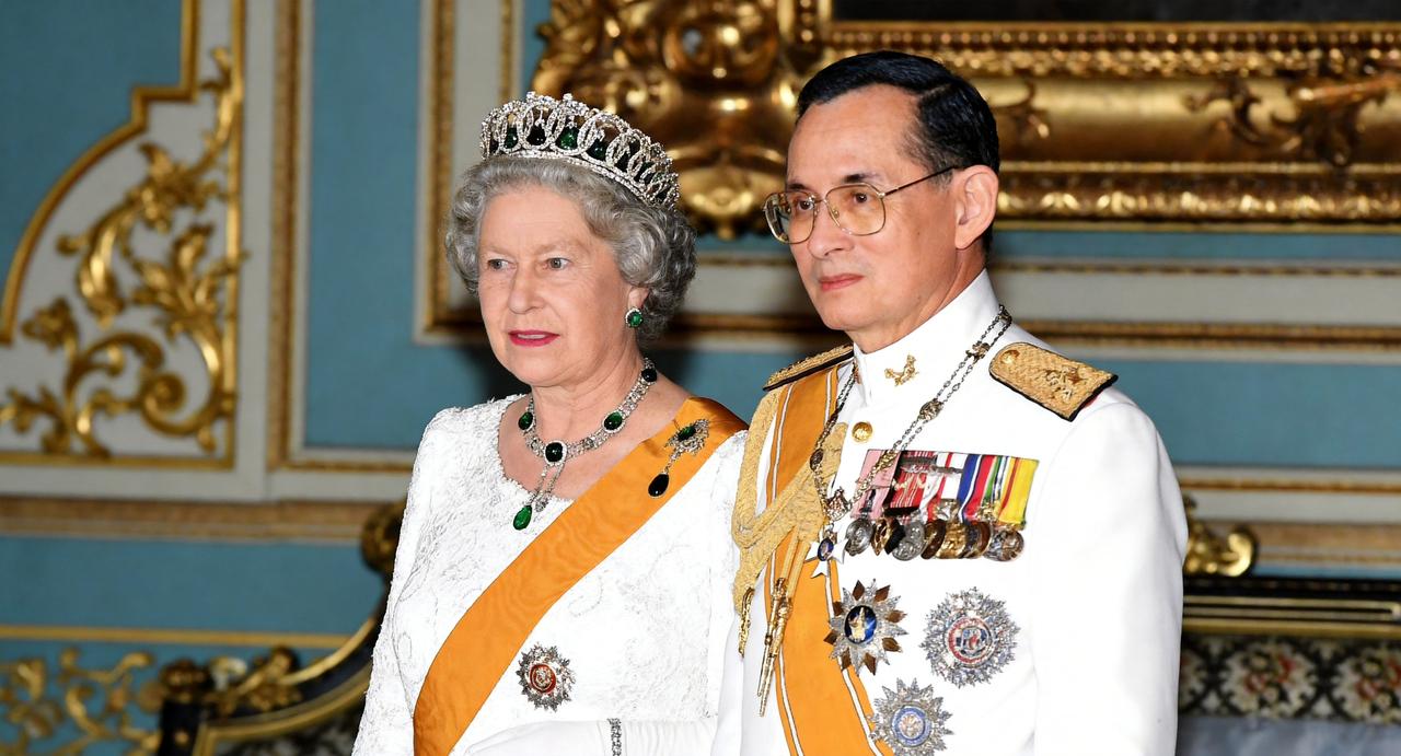 这两位是在各自国家在位时间最长的君主,也是在近代在位时间排名第一与第二长的君主。左边这位正是英国女王伊丽莎白二世。她从1952年26岁即位,到2015年89岁时已成为英国历史上在位时间最长的君主,打破了英国女王维多利亚女王63年7个月零2天的时长记录。 2022年9月8日,英国女王伊丽莎白二世去世,享年96岁,在位时长70年零214天,是近代全球在位时间最长的君主,当然也是女性君主史第一。 近代全球在位时间第二长的君主正是泰国国王普密蓬·阿杜德。普密蓬从1946年6月9日即位到2016年10月13日去世,在位时间70年零126天,比伊丽莎白二世短80多天。他既是泰国历史上在位时间最长的君主,也是近代全球在位时间第二长的君主。普密蓬比伊丽莎白二世小一岁,但他要比伊丽莎白二世早6年即位。