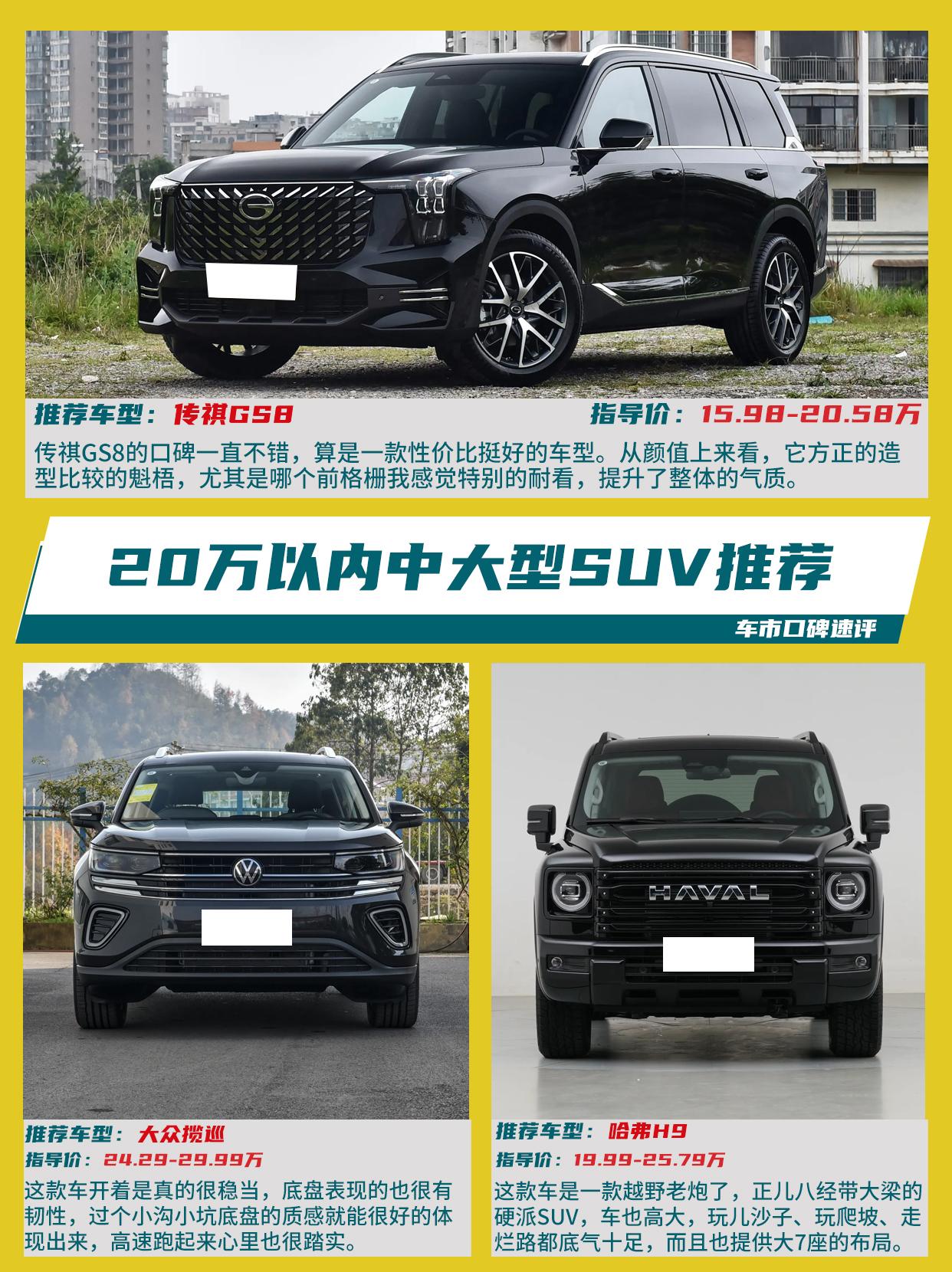 现在手握20万块钱是可以买到更大尺寸的SUV车型的,气场更强、空间也更宽敞,今天给大家介绍三款中大型SUV,分别是传祺GS8、大众揽巡、哈弗H9,看看哪一款更适合你。 传祺GS8,厂商指导价15.98-20.58万 传祺GS8的口碑一直不错,算是一款性价比挺好的车型。从颜值上来看,它方正的造型比较的魁梧,尤其是哪个前格栅我感觉特别的耐看,提升了整体的气质。动力配的是2.0T加8AT组合,动力足油门一点也不虚,超车也很给力。槽点就是油耗稍微也有点高,尤其是四驱的油耗更高了。 大众揽巡,厂商指导价24.29-29.99万 这款车开着是真的很稳当,底盘表现的也很有韧性,过个小沟小坑底盘的质感就能很好的体现出来,高速跑起来心里也很踏实。槽点也有,就是全系需要加95号的汽油,这一年的成本要增加不少。 哈弗H9,厂商指导价19.99-25.79万 这款车是一款越野老炮了,是正儿八经带大梁的硬派SUV,车也高大,玩儿沙子、玩爬坡、走烂路都底气十足,而且也提供大7座的布局,全家出行也可以。就是车子太大了,超过了5米,在城市狭窄的场景下停车比较麻烦,出去玩儿的时候才能发挥最大价值。 这三款车,如你想要性价比和家用空间,GS8比较合适;看重德系质感不差油钱的,可以看看揽巡;真要玩越野和走烂路的,不用考虑直接上哈弗H9才是正解,对不?【来自懂车帝车友圈】