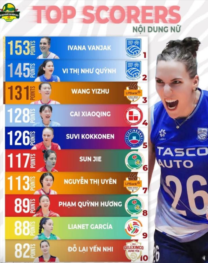 国际排坛动态王艺竹越南全国联赛第一阶段得分榜 1.伊万娜 153分 (前河南外援)2.微氏如琼 145分3.王艺竹 131分4.蔡晓晴 128分5.科克宁 126分6. 孙杰 117分PS:孙杰和车文涵应该还留在越南,将会代表通信兵团打雄王杯……蔡晓晴