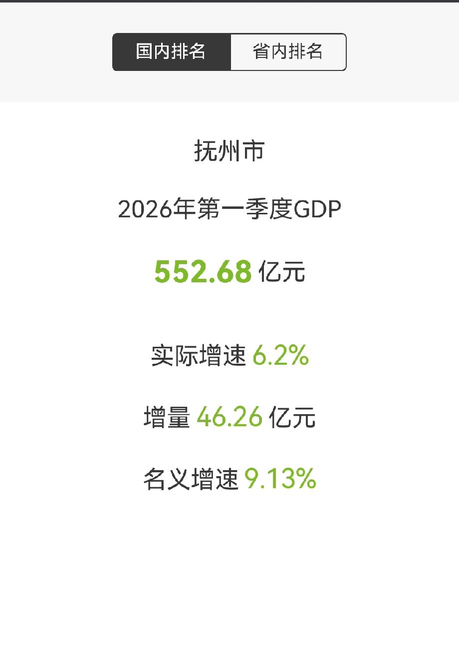 2026年抚州市第一季度GDP公布 抚州市 2026年第一季GDP 552.68亿元 实际增速6.2% 增量46.26亿元 名义增速9.13%