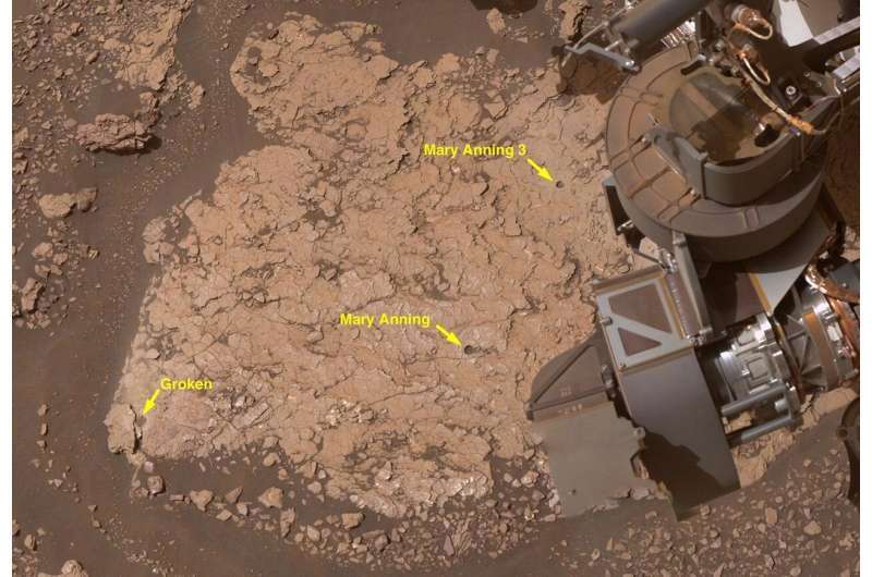 图一:美国宇航局好奇号火星车在一处以19世纪英国古生物学家命名的“玛丽·安宁”地点拍摄了这张自拍照,图源:NASA/JPL-Caltech/MSSS图二:好奇号火星车上的桅杆相机在探索“含黏土单元”期间拍摄了这张拼接图像,图源:NASA/JPL-Caltech/MSSS图三:好奇号在离开格伦托里登地区途中,于该地点钻取三份岩石样本的采样位置,图源:NASA/JPL-Caltech/MSSS