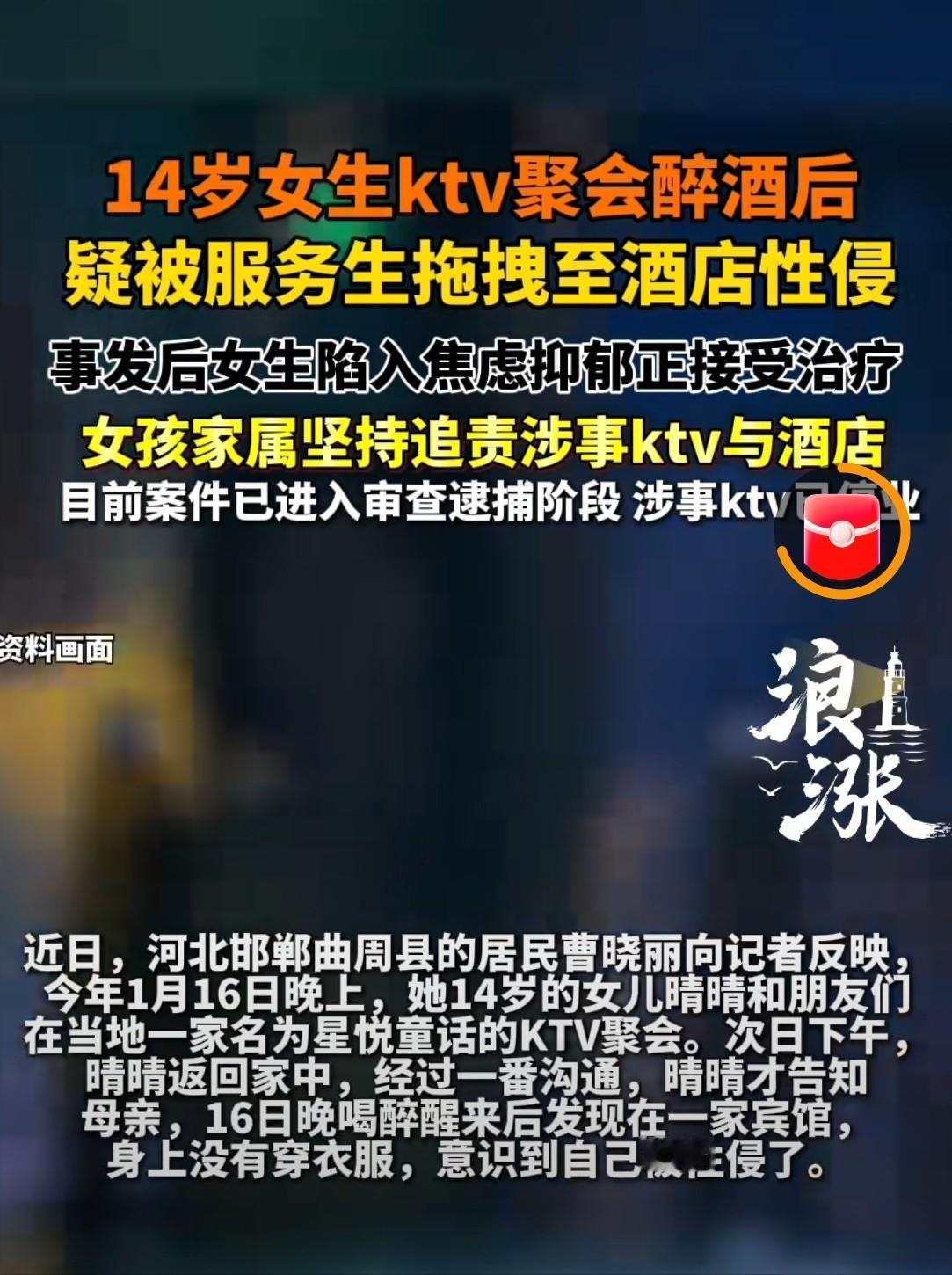 才14岁!一个初三的小姑娘。 在KTV聚会喝得烂醉如泥,竟被男服务员黄某轩直接抱上车,弄到附近宾馆糟蹋了,听说现在已经抑郁了。 河北邯郸曲周县这起案子,看得人脊背发凉。 时间拉回2026年1月16号晚上,河北曲周当地一家KTV里,灯光晃得人眼晕,震耳的音乐盖过了一群未成年人的打闹声。 初三女生晴晴,跟着几个朋友来这儿聚会,这是她第一次和朋友来这种娱乐场所,心里既好奇又有点紧张,她以为就是一次普通的周末放松,没曾想一场无法挽回的噩梦正悄悄向她逼近。 KTV前台,20多岁的服务员黄某轩一边结账一边售酒,目光频频扫向这群未成年人,眼神里满是不怀好意,看着他们一杯接一杯灌啤酒,脸上露出了得意的笑。 周围的工作人员要么低头玩手机,要么闲聊,对眼前的违规行为视而不见,既不上前阻拦,也不查验他们的身份证,完全无视相关规定。 凌晨,晴晴醉得站不稳,意识模糊地瘫在沙发上,朋友们只顾自己玩乐,完全没注意她的状态。黄某轩瞅准机会,假好心说送她休息,轻易就将不省人事的晴晴带离KTV,无人阻拦、无人询问。 酒店的监控清晰拍下全过程,黄某轩半扶半拽着毫无反抗力的晴晴,快速登记后将她拖进房间,动作熟练且毫无犹豫,酒店工作人员也未按规定核实晴晴的未成年人身份。 第二天清晨,晴晴在陌生的宾馆床上醒来,头痛欲裂,浑身酸痛,连抬手的力气都没有,最让她惊恐的是,自己竟然一丝不挂。 脑海里一片空白,昨晚的记忆像是被橡皮擦过,只剩下断断续续的碎片:有人拽着她的胳膊,还有刺鼻的酒气和陌生的气息,剩下的全是深入骨髓的恐惧。 她慌乱地摸索着穿上衣服,跌跌撞撞地跑回了家,把自己关在房间里,不敢开灯,也不敢告诉任何人。 母亲曹晓丽发现女儿不对劲,平时活泼的孩子变得沉默寡言,眼神躲闪,一整天都魂不守舍。直到下午,在她反复耐心地追问下,晴晴才崩溃大哭,断断续续说出了那个让她羞耻又恐惧的夜晚。 曹晓丽如遭雷击,她怎么也想不到,只是一次普通的朋友聚会,竟让女儿遭受了如此巨大的伤害。 曹晓丽立刻报警,誓要为女儿讨回公道。警方迅速调取监控锁定黄某轩,案发三个月后,曲周县公安局鉴定显示,送检精斑与黄某轩基因完全匹配,证据确凿。 3月9日,警方以涉嫌强奸罪将案件移送曲周县检察院,4月22日官方通报,黄某轩被依法批准逮捕。 涉事KTV因违规接纳未成年人、售酒被关停罚款40万元,酒店因未落实实名登记被停业整顿2个月、罚款2万元。 可这些处罚,真的能抚平晴晴心里的伤吗? 据曹晓丽说,女儿现在精神状态特别差,被查出有严重的焦虑抑郁问题,每天都要靠药物稳定情绪,还得做心理疏导,正在医院住院治疗。 以前成绩不错、性格开朗的她,现在变得沉默寡言,甚至不敢见人,连正常生活都成了难题。这场突如其来的噩梦,很可能会伴随她一生,而这一切,本来是可以避免的。 《未成年人保护法》明确规定,营业性KTV、酒吧不得接纳未成年人、不得售酒,可很多KTV为了盈利,对未成年人饮酒视而不见,甚至主动售酒。 这起案件里三道防护线全失守:KTV违规接纳售酒,酒店未落实未成年人入住规定,晴晴和朋友们也缺乏自我保护意识,不懂饮酒的危害。 更揪心的是,晴晴醒来后选择隐瞒,这是很多受侵害未成年人的共性——羞耻和恐惧像枷锁一样困住他们,让他们不敢开口,也不敢告诉家人,这反而给了犯罪分子更多可乘之机。 很多家长也忽视了对孩子的性教育和安全教育,总觉得孩子还小,没必要讲这些,却不知一时的疏忽,可能会让孩子陷入危险。 对伤害未成年人的犯罪,必须零容忍。黄某轩利用工作便利侵害醉酒少女,性质恶劣,理应受到法律严惩,付出沉重代价。 相关部门也该反思,监管是否到位、处罚是否有威慑力,唯有将法律法规落到实处,加强日常检查,才能从根源上杜绝悲剧。 涉事场所的处罚看似到位,但罚款对其可能无关痛痒,整顿也只是暂时的,建立长效监管机制,才是杜绝违规的关键。 孩子需要全社会共同呵护,作为家长,更要多关心、多管教孩子,平时多和孩子沟通,明确告知他们哪些地方不能去、哪些事不能做,教会他们基本的自我保护方法,提高安全意识,别让一时的疏忽酿成终身遗憾。 娱乐场所守好底线,相关部门加大监管,法律当好后盾,多方发力,才能给孩子一个安全的成长环境。 晴晴的遭遇不是个例,与其事后愤怒谴责,不如做好事前预防,别让更多孩子遭受这样的噩梦。 最后想问大家,保护未成年人,到底该从哪一步抓起?评论区说说你的看法,别让孩子再受这样的委屈。 信息来源:河北曲周KTV服务员涉嫌侵害未成年人案件通报丨新华社
