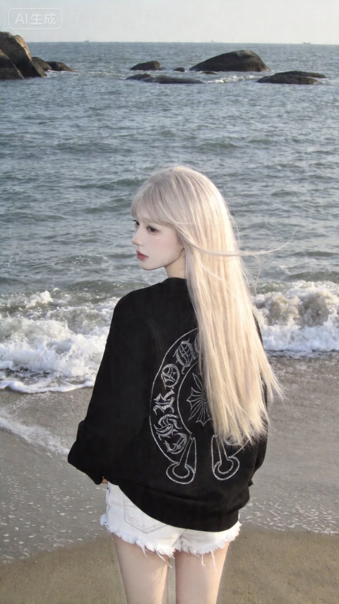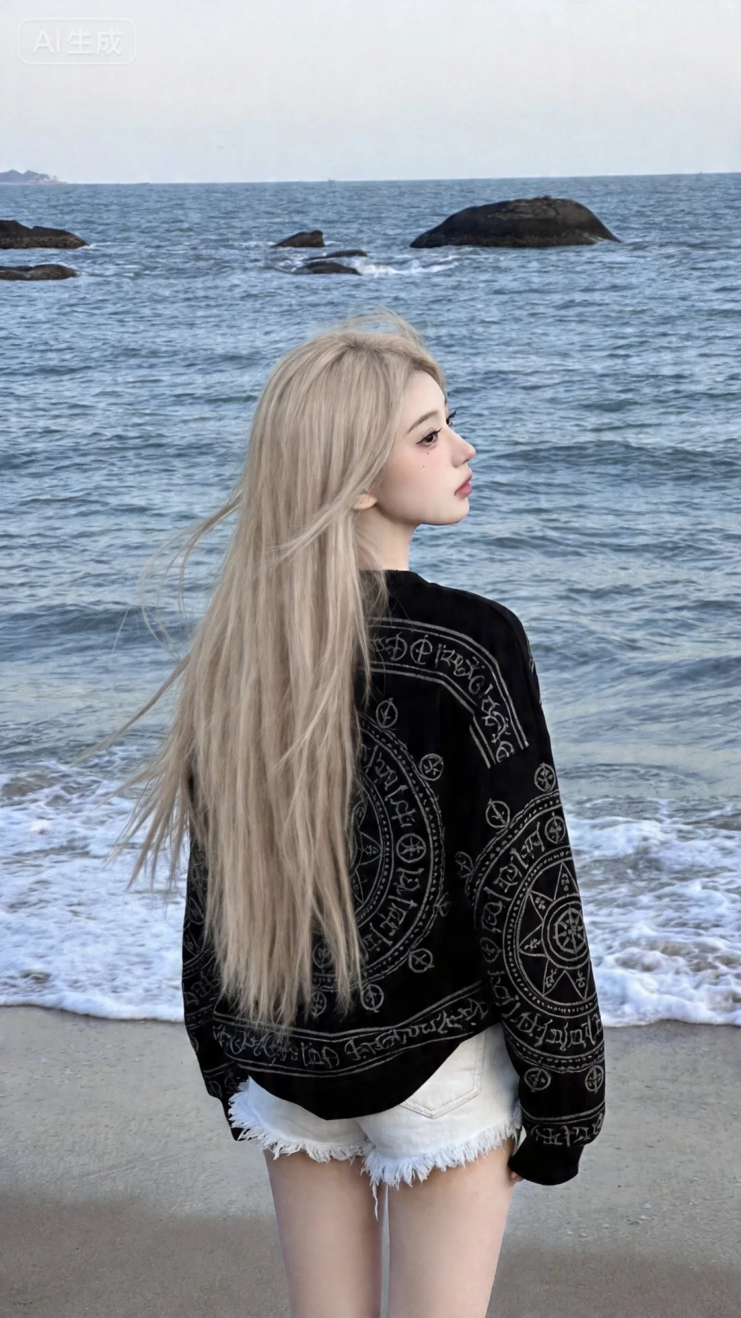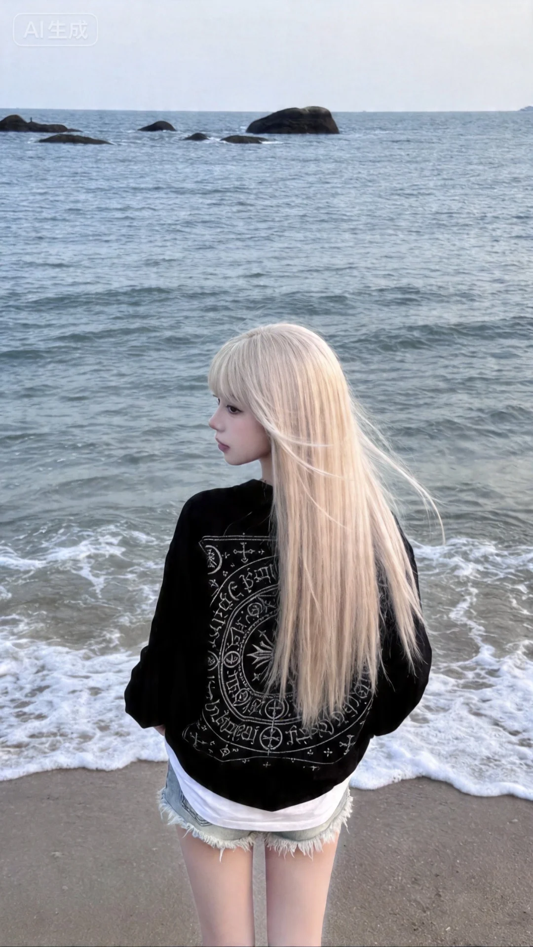 一位长发及腰、模样似洋娃娃般可爱的女生。构图随意却尽显生活中的绚丽日常,人像摄影,日常快照风格,非精心构图或打光,妖冶少女,身材娇好,高颜值,冷白皮,时尚穿搭,瓜子脸尖下巴,皮肤白皙,底妆通透,肤色均匀自然,纯欲风。光线柔和自然,非均匀打光,表情自然松弛,照片毫无修饰感,带有生活真实感。ccd拍照感,真人真实,黄金比例大师摄影手,呈现出极简主义的风格,画面的核心主体是冷白皮女生,背对着镜头,她的一头浅金色长直发垂至腰下,在海风中微微扬起,带着自然的蓬松感。她身着黑色繁琐符文图案上衣,内搭白色毛边牛仔短裤,露出纤细的小腿,整体风格随性又清冷,画面只到大腿处。背景是一片广袤的海面,海浪拍打着沙滩,泛起白色的泡沫,远处几块深色的礁石点缀其间。光线柔和,没有强烈的明暗对比,使人物与自然环境完美融合,如同置身于温柔的梦境之中。运用中景拍摄手法,人物位于画面中心偏下的位置,背影占据了画面的主要视觉空间,背景的海天一线和礁石元素,进一步加强了画面的纵深感和氛围感。