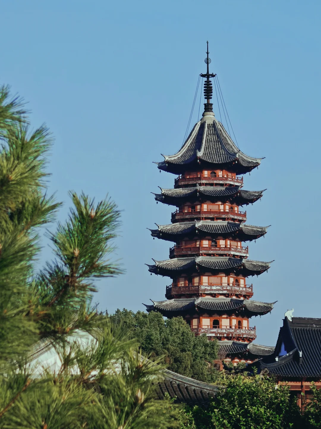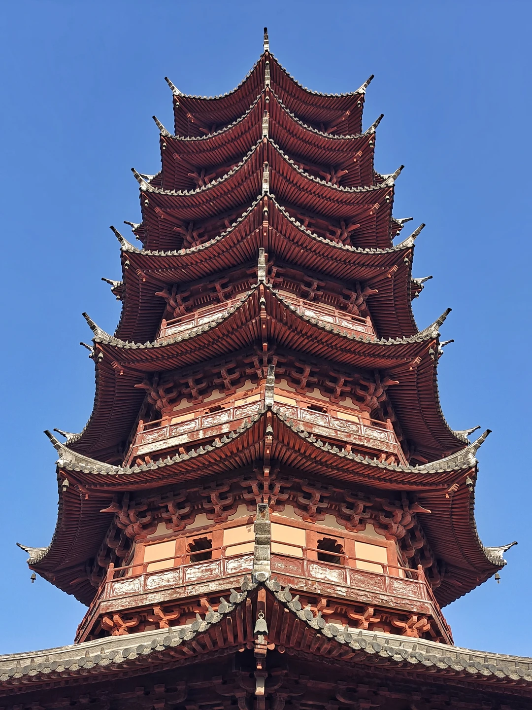 始建于三国赤乌十年,现存塔身为北宋景德元年遗存,木质外檐为重修,高53米,为七级八面砖木结构楼阁式佛塔。塔身群柱框架结构在现存古塔中较为罕见。塔内部空间上下不同,下部五层回廊式,上部两层塔室空间连成体。内部回廊和串道以砖刻及少量木构件仿造木构建筑的室内,惟妙惟肖。