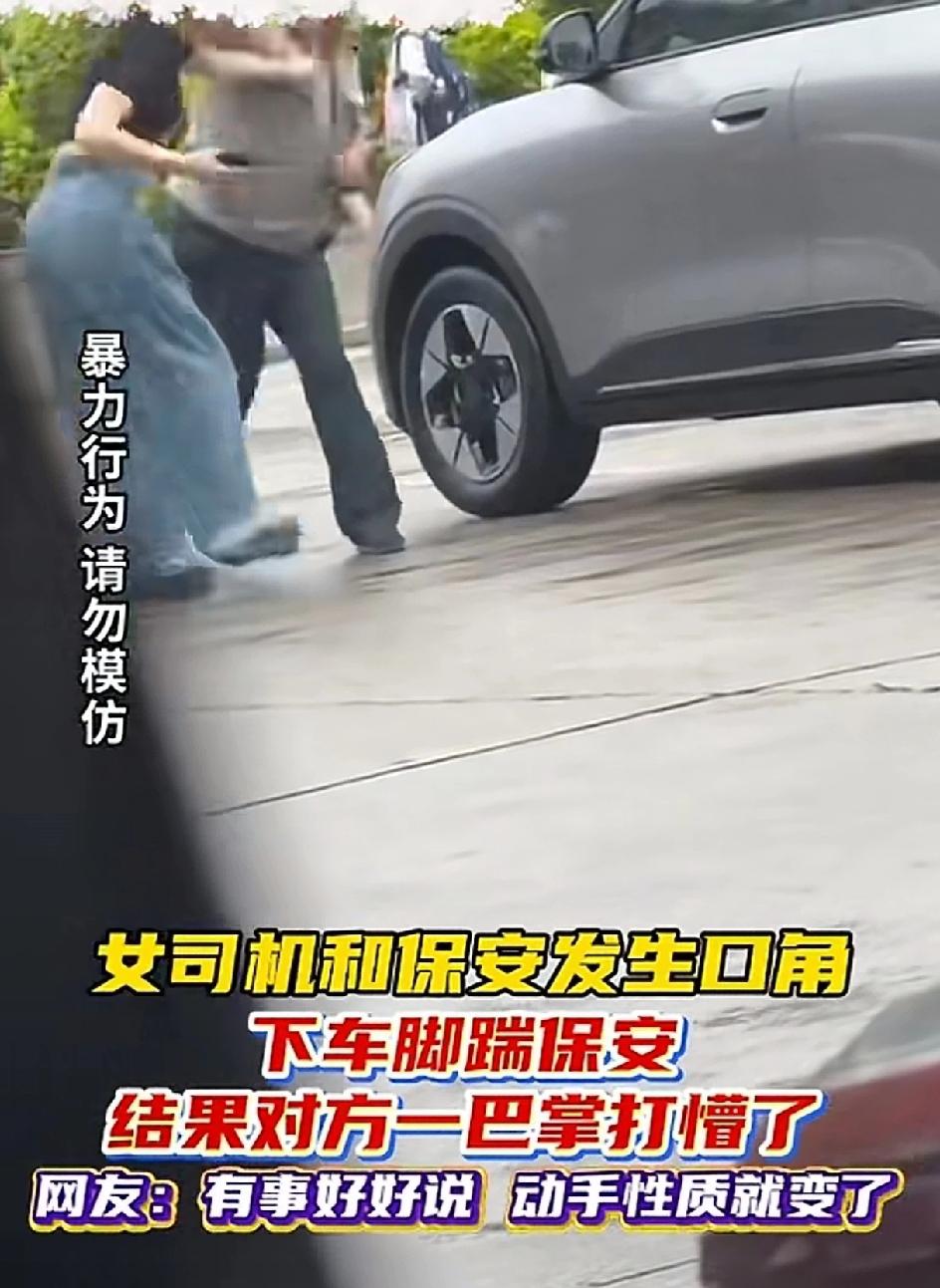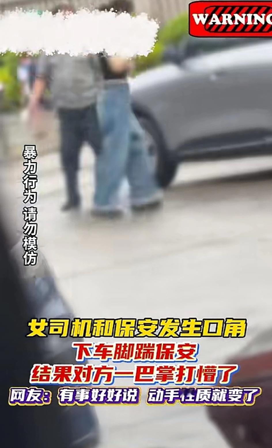 女司机和保安发生口角,下车用脚踹保安,保安反手一巴掌。女子瞬间安静了。 没人看,是女子先动的手,所以她有错在先,保安反手给了一个巴掌,这对暴力的反击。 有话好好说,一动手性质就变了。 保安被踹了一脚,女司机被打了一巴掌,女司机赶紧给家人打电话,想要找援助。