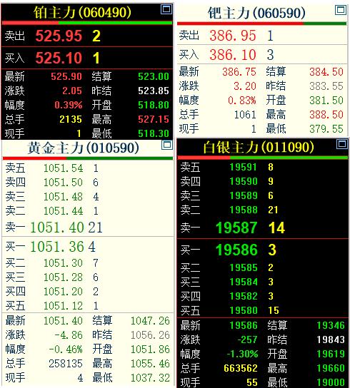 今天是4月22日, 星期三, 国内贵金属四大品种, 涨跌不一; 有些品种低开高走。 如下图所示: 铂主力上涨0.39%; 钯主力上涨0.83%; 黄金主力回落0.46%; 白银主力下跌1.3%。