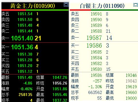 4月22日,星期三, 国内上海期货交易所的 黄金和白银双双回落下跌。 如下图所示: 黄金期货收盘于1051.4,跌幅0.46%; 白银期货收盘于19586元,跌幅1.3%。 但是期货小褚 认为下方支撑比较强, 有望重启反弹上涨!!!