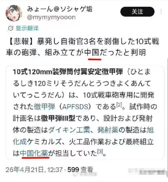 日本坦克炸膛 3 死 1 伤,甩锅 “中国制药公司”?真相曝光笑掉大牙。 就在昨天,也就是 4 月 21 日早上 8 点 40 分,日本九州大分县的日出生台演习场传来一声惊天动地的巨响。一辆号称日本陆上自卫队王牌的10式主战坦克,在进行120毫米主炮实弹射击训练时,炮弹没有飞出去,直接在炮管里炸了膛。 懂点军事的人都知道,坦克炸膛有多可怕。一发120毫米的高爆弹在一个完全密封的钢铁罐头里起爆,上千度的高温和无死角的冲击波无处散去,连厚重的铁板都能当场撕开,更别提里面活生生的人了。 果然,事故结果很快出来了:炮塔里的三名男性队员当场死亡,一名21岁的女驾驶员重伤昏迷,被紧急送往医院抢救。日本防卫省当天就宣布,全面暂停所有10式和90式坦克的实弹训练,成立专门的调查委员会彻查事故原因。 本来这就是一起普通的军工事故,全世界哪个国家没出过坦克炸膛的事?可偏偏就在这个时候,日本网络上突然炸出了一个惊天大瓜,瞬间把整个日本右翼群体都给点燃了。 有人在网上爆料说,这次炸膛的炮弹,是由一家“中国制药公司”生产的! 消息一出,日本右翼直接原地爆炸。各种阴谋论满天飞,什么“中国在炮弹里做了手脚”、“中国用假药毒死了日本士兵”、“中国已经渗透到日本军工的核心环节”之类的鬼话,在推特和雅虎新闻的评论区里刷了屏。 甚至有日本议员在社交媒体上公开叫嚣,要求立刻对所有中国在日企业进行全面审查,禁止任何中国产品进入日本军工供应链。还有人喊出了“抵制中国货”的口号,连超市里的中国产酱油和方便面都成了他们攻击的目标。 我看到这些消息的时候,差点没笑喷出来。我当时就在想,中国什么时候有这么厉害的制药公司了?居然能给日本自卫队生产炮弹?这跨界也跨得太离谱了吧? 结果我一查,真相差点把我眼泪都笑出来了。 原来,生产这枚炮弹的公司,名字确实叫“中国化药株式会社”。但它跟咱们中国半毛钱关系都没有! 这家公司的总部在日本广岛县的吴市,也就是当年被美国原子弹炸了的那个地方。它之所以叫“中国化药”,是因为吴市属于日本的“中国地区”。对,你没听错,日本自己有个地方就叫“中国”,包括广岛、冈山、山口、岛根、鸟取五个县。 这家“中国化药株式会社”成立于1947年,也就是二战结束后的第二年。它最早就是生产炸药和炮弹的,从1951年开始给美军生产特需弹药,1957年正式成为日本防卫厅的指定供应商。 现在它的主要业务包括防卫火工品、工业炸药、医药品和饮料。没错,它确实生产药品,但它首先是一家军火公司,其次才是制药公司。而且它从头到尾都是一家100%的日本公司,跟咱们中国没有任何关系。 就因为名字里带了“中国”两个字,就被日本右翼当成了中国公司,还编出了这么一出荒诞不经的阴谋论。你说这不是智商掉到脚后跟了是什么? 其实仔细想想,这也不是日本第一次闹这种笑话了。之前日本有个叫“中国电力”的公司,也被右翼当成了中国企业,要求政府禁止它参与日本的核电项目。还有个叫“中国新闻”的报纸,也被他们骂成是“中国的喉舌” 这些人只要一看到“中国”这两个字,就立马失去理智,变成了只会嗷嗷叫的疯狗。他们宁愿相信这种一眼就能看穿的谎言,也不愿意去查一下最基本的事实。 说到底,这就是一种极度自卑和恐惧的表现。他们害怕中国的强大,害怕中国超过日本,所以才会把所有不好的事情都归咎于中国。在他们眼里,中国就是一个无所不能的恶魔,什么坏事都是中国干的。 可他们忘了,真正应该反思的是他们自己。这次坦克炸膛事故,根本就不是什么中国搞的鬼,而是日本军工体系自己出了问题。 据日本防卫省内部的审计报告显示,日本自卫队现役的10式坦克用的炮弹,有23%都已经超期服役了。有些炮弹是2017年出厂的,本该2025年就退役,现在还在打。2019年山梨县就发生过一起一模一样的炸膛事故,当时查出来是引信老化,结果换了个批次就完事了。 四年过去了,同一批引信又出现在了大分的炮膛里。这难道不是日本自卫队管理混乱、不负责任的铁证吗? 他们宁愿花大价钱去买美国的F-35,去发展远程导弹,去搞什么“对敌基地攻击能力”,却连最基本的弹药维护都做不好。这样的军队,还整天叫嚣着要“保卫日本”,简直就是天大的笑话。 现在好了,自己的坦克自己炸了,死了三个人,不想着怎么改进管理,怎么提高军工质量,反而第一时间甩锅给中国。这种自欺欺人的做法,除了暴露他们的愚蠢和无能之外,什么用都没有。 我只能说,日本右翼们,你们继续演吧。你们越是这样,就越显得你们可怜又可笑。真正的强大,不是靠抹黑别人得来的,而是靠正视自己的问题,脚踏实地地发展。 如果你们一直活在自己的幻想里,一直把中国当成假想敌,那么等待你们的,只会是一个又一个像今天这样的笑话。