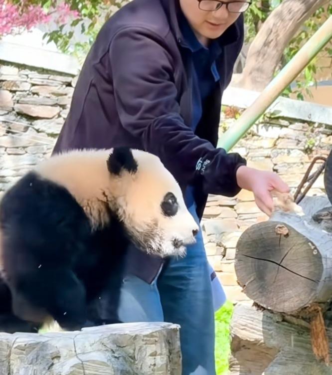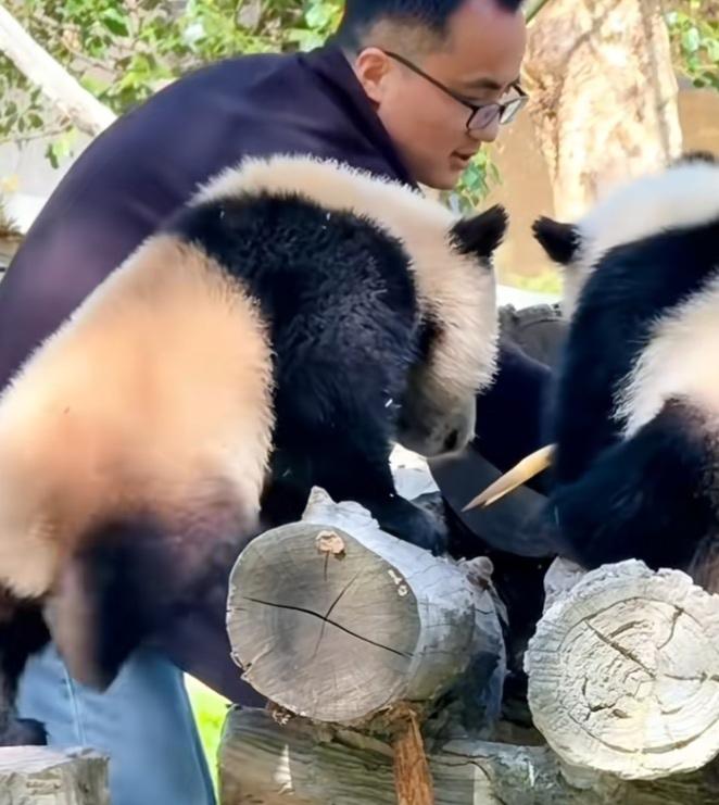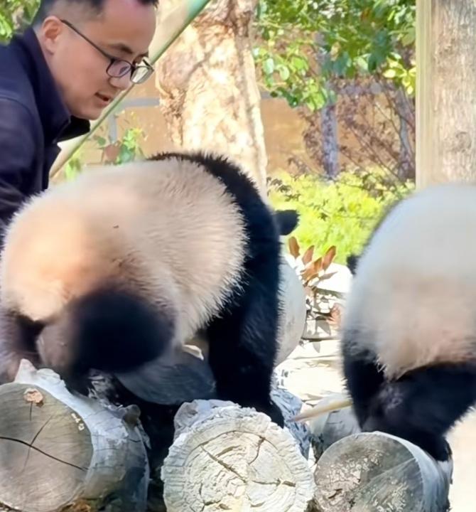 人类虽然和国宝语言不通,但是我们可以多动脑筋,经过一系列动作来和国宝进行交流,国宝们都非常聪明,一看我们的动作,就会明白我们的用意!徐奶爸想让姚小八和乔小九到大的平台上去吃饭,但是和它们语言不通怎么办呢?只见徐奶爸手里拿了一根非常新鲜的嫩笋,放到姚小八面前,非常有耐心非常温柔地一步步引导它从别的地方爬上大平台和乔小九一起坐在上面品尝美味多汁的竹笋,这画面太温馨,太有爱了!和动物在一起,多一份耐心,多一份爱心,就会收获很多快乐和美好![赞][比心]熊猫 姚小八 乔小九 大熊猫 国宝 徐奶爸 (cr:@草虫子)