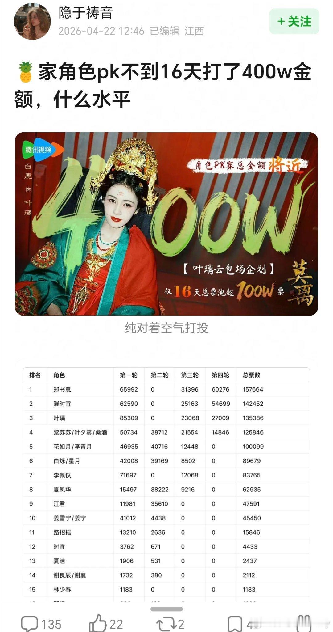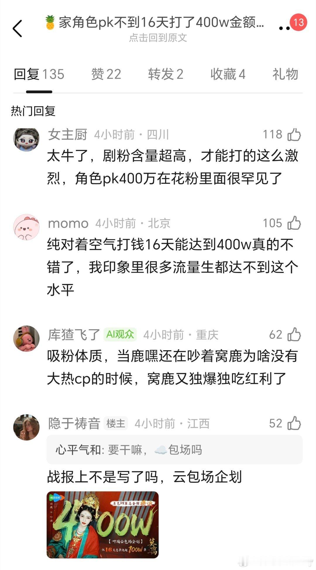 白鹿粉丝不到16天就氪金400w+,流量花里面属于很少见的,鹿姐观众缘好+演技台词全部过关,本身就具备很强的扛剧能力,粉丝氪金算是锦上添花!