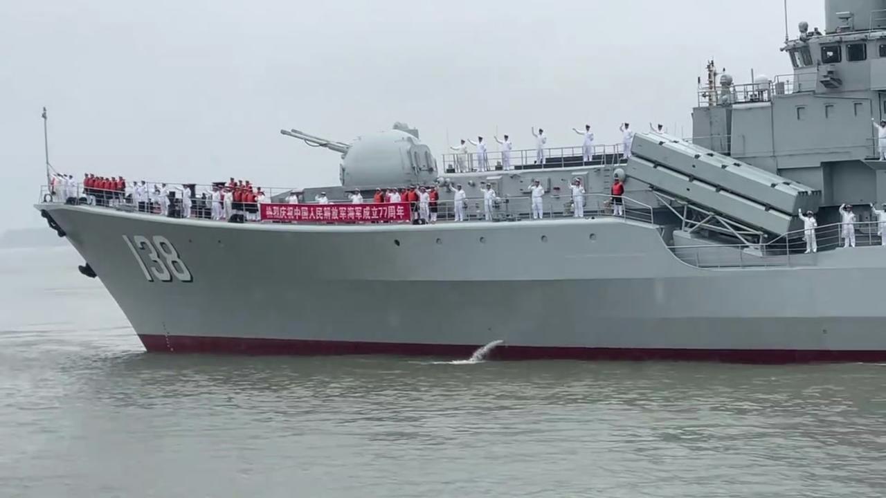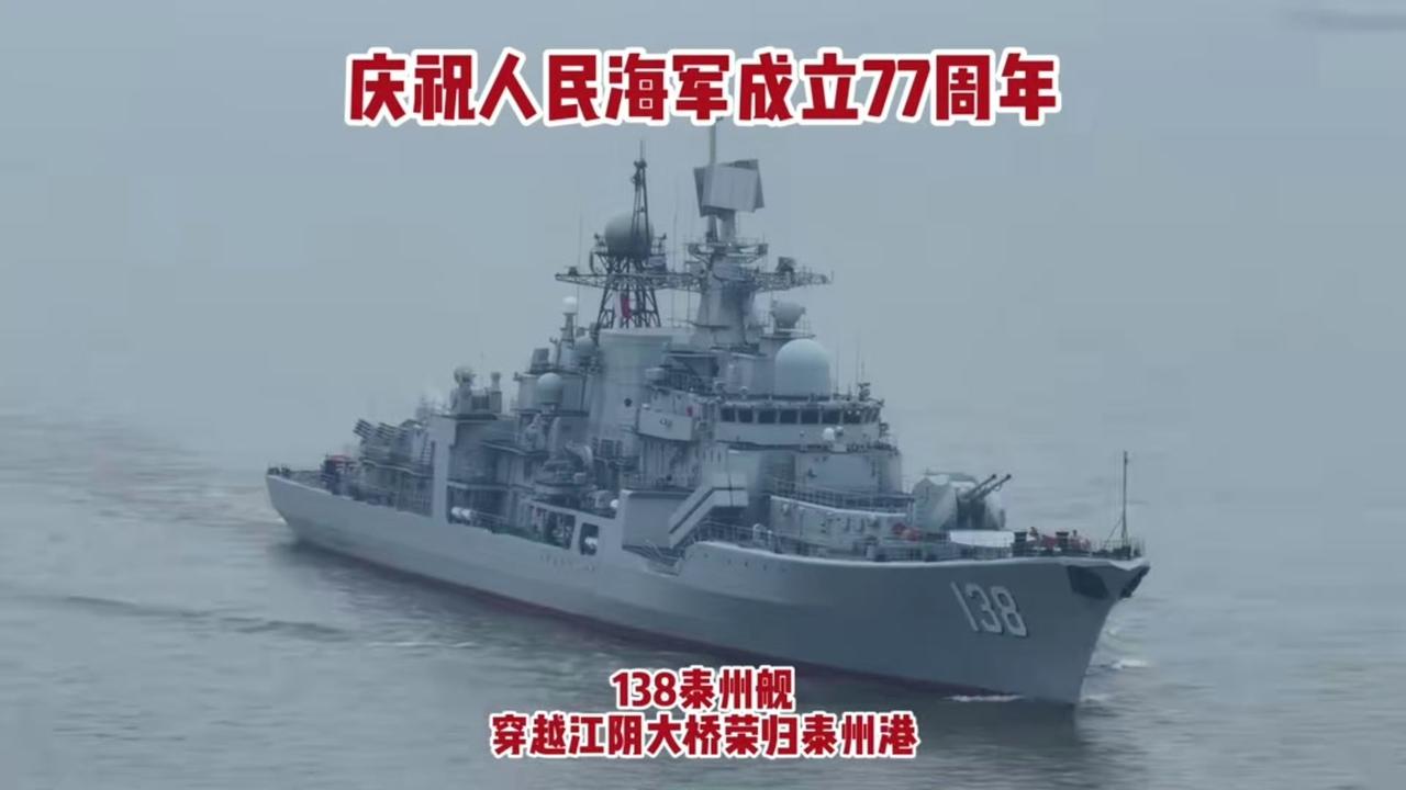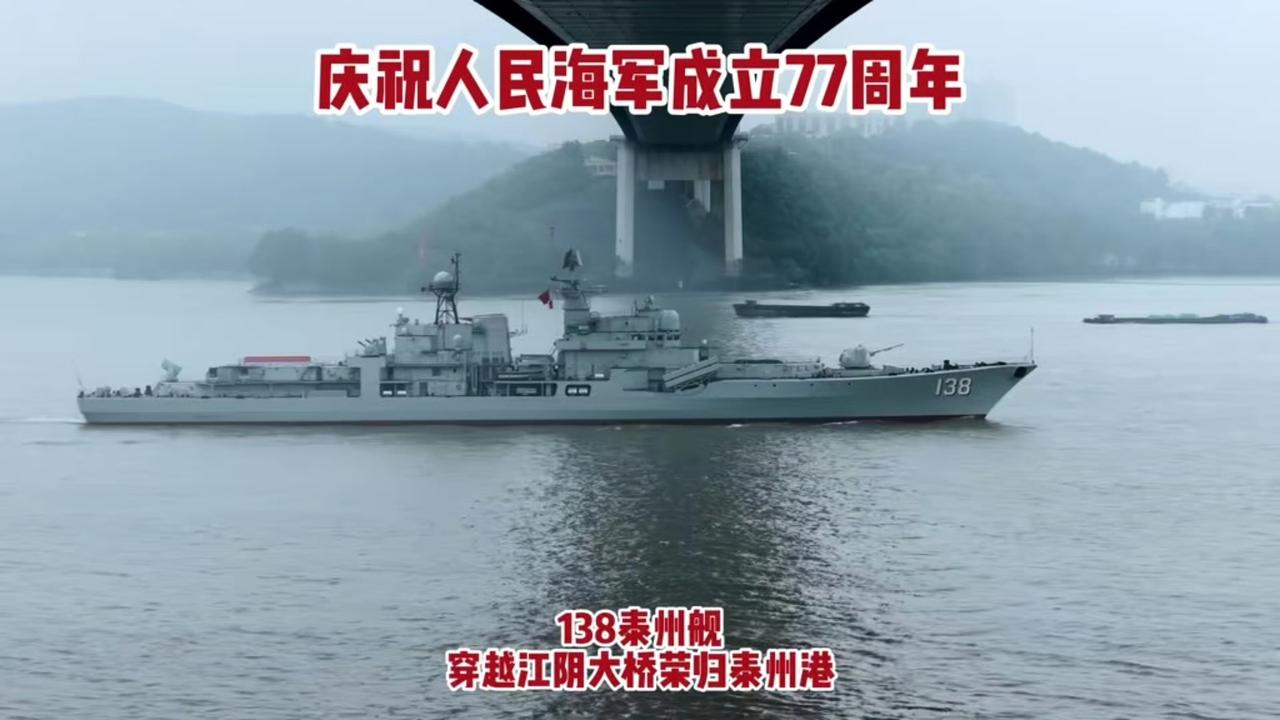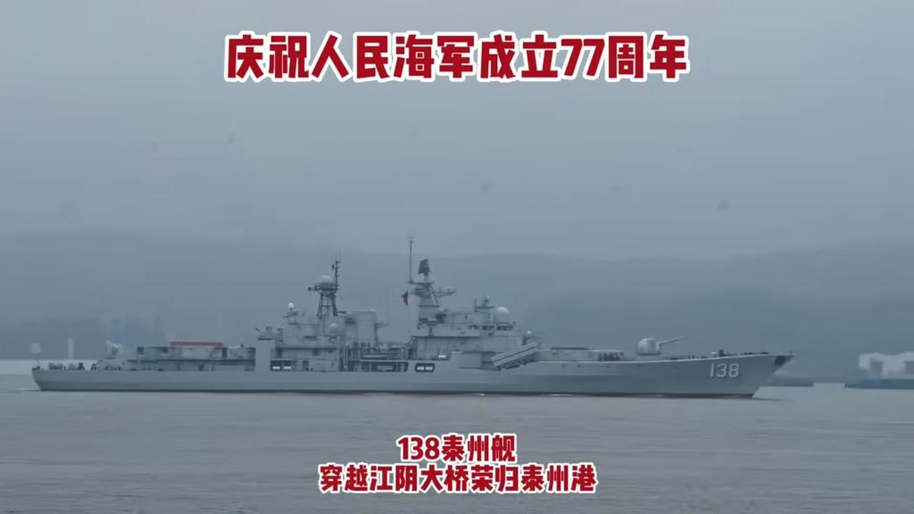 庆祝人民海军成立77周年,138泰州舰穿越江阴大桥荣归州港! 从视频截图可以看到,改装后的138泰州舰相比以前改装的136杭州舰和137福州舰,主要区别在于:红旗10从舰艏移到了舰艉,垂发从前后各16单元改成了前32单元后16单元。同时,杭州舰、福州舰保留了AK630近防炮,泰州舰则把卡什坦换成了1130近防炮。