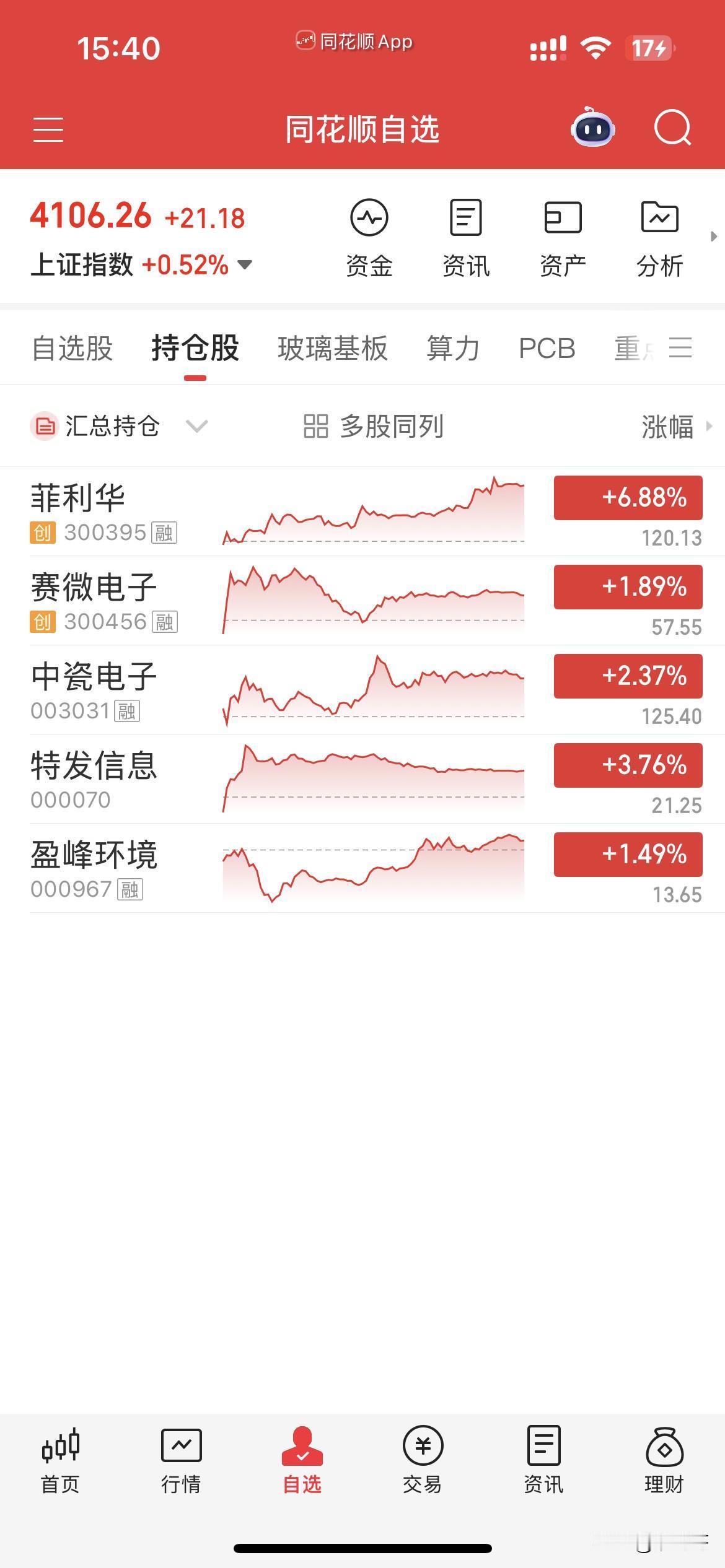 4月22日,个人操作汇总: 一,清仓:特发,盈峰, 二,新开:菲利华, 三,继续持有:中瓷,赛微, 特发,感觉冲不动,6个点止盈了, 盈峰,总觉得后面能涨,但是绿一天心里不爽,下午反弹,水下1点多割了, 菲利华,据说M9级电子布国内独此一家,3个多点上了,小肉, 中瓷,趋势在,继续锁仓, 赛微,谷歌大会预期还在,等等看, 今天大盘指数上涨,个股分化, 主要都是业绩好的,大市值,高价位的科技股在拉升,很多都创了新高,也让很多散户不适应,反正大资金,机构是赚的盆满钵满,这种现象何时结束暂且不论!