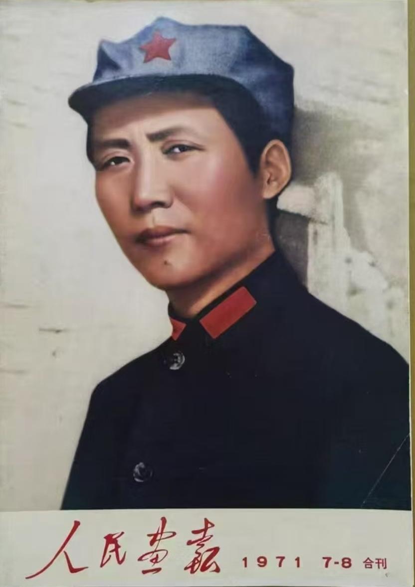 《人民画报》 1971年7~8月合刊。 这是毛泽东同志在延安时期拍的一张照片,毛主席平时不喜欢戴帽子。据说这只帽子是从美国友人史沫特莱头上临时摘下来戴上的。