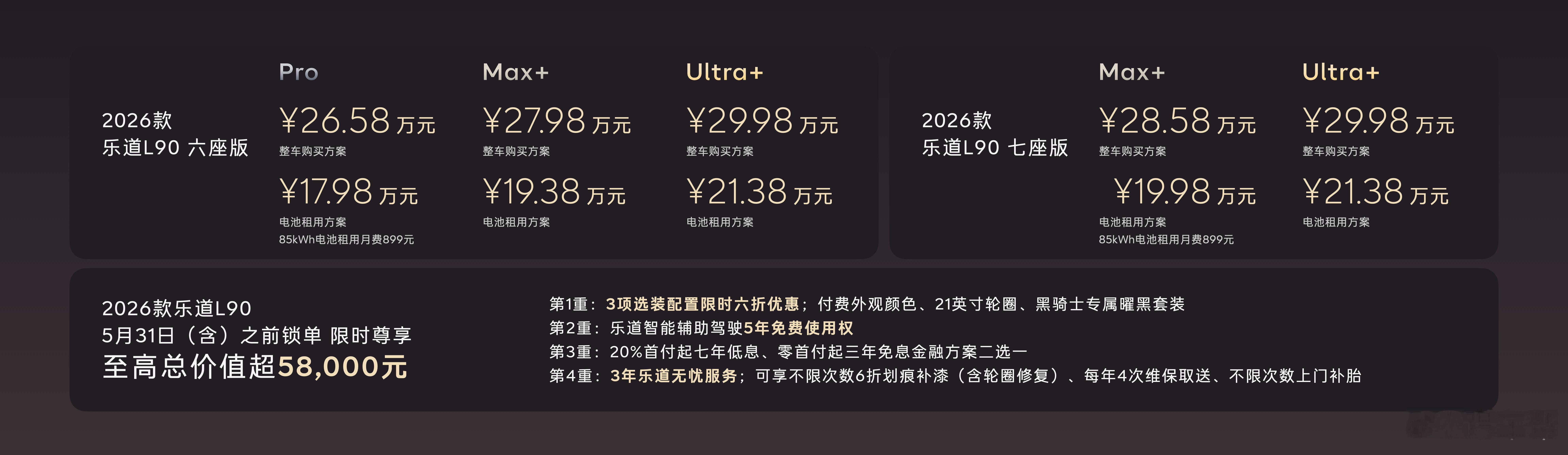 沙溢玩嗨了李斌有诚意乐道汽车 2026款乐道L90加量不加价,超70项软硬件升级,整车购买26.58万元起,租电方式购买只有17.98万元起!这可是蔚来旗舰智能科技全家桶上车的大三排SUV,再加上限时5.8万元的购车权益,捅破了该级别的超值天花板。