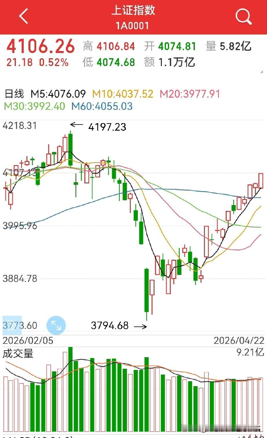 接下来会不会加速上涨? 可能会有一个短暂的加速期,然后持续震荡上行… 周三继续收出小阳,创业板更强一些,整体上市场是非常强的,这正印证了老股民近期的观点:上升趋势已经形成,包括创业板的突破,这里不只是短期平台突破,包括2021年高点突破的判断,都一一印证! 趋势一但形成,那么趋势的力量是很强的,所以,短线,即接下来一两个交易日,还有拉出中阳线的可能性。 因为,市场情绪中犹豫的人还不少,不敢跟,逢高出还占不少比例,所以指数还会向上运行。 不过,一但市场情绪偏向一致(相对的),即看空的人少了,那么就会出现短线调整。 个人认为,后期,会出现急跌慢涨的趋势,再现慢牛格局,而且这种趋势可能会维持相当长,至于为什么会这样,空了再仔细分析。 回到盘面,创业板更强,这是老股民前面提到这一轮要多关注创业板; 而上证,4150附近将是前期高位平台成交密集区,接下来4100~4200点可能会有时间稍长的反复过程,这个要有心理准备。