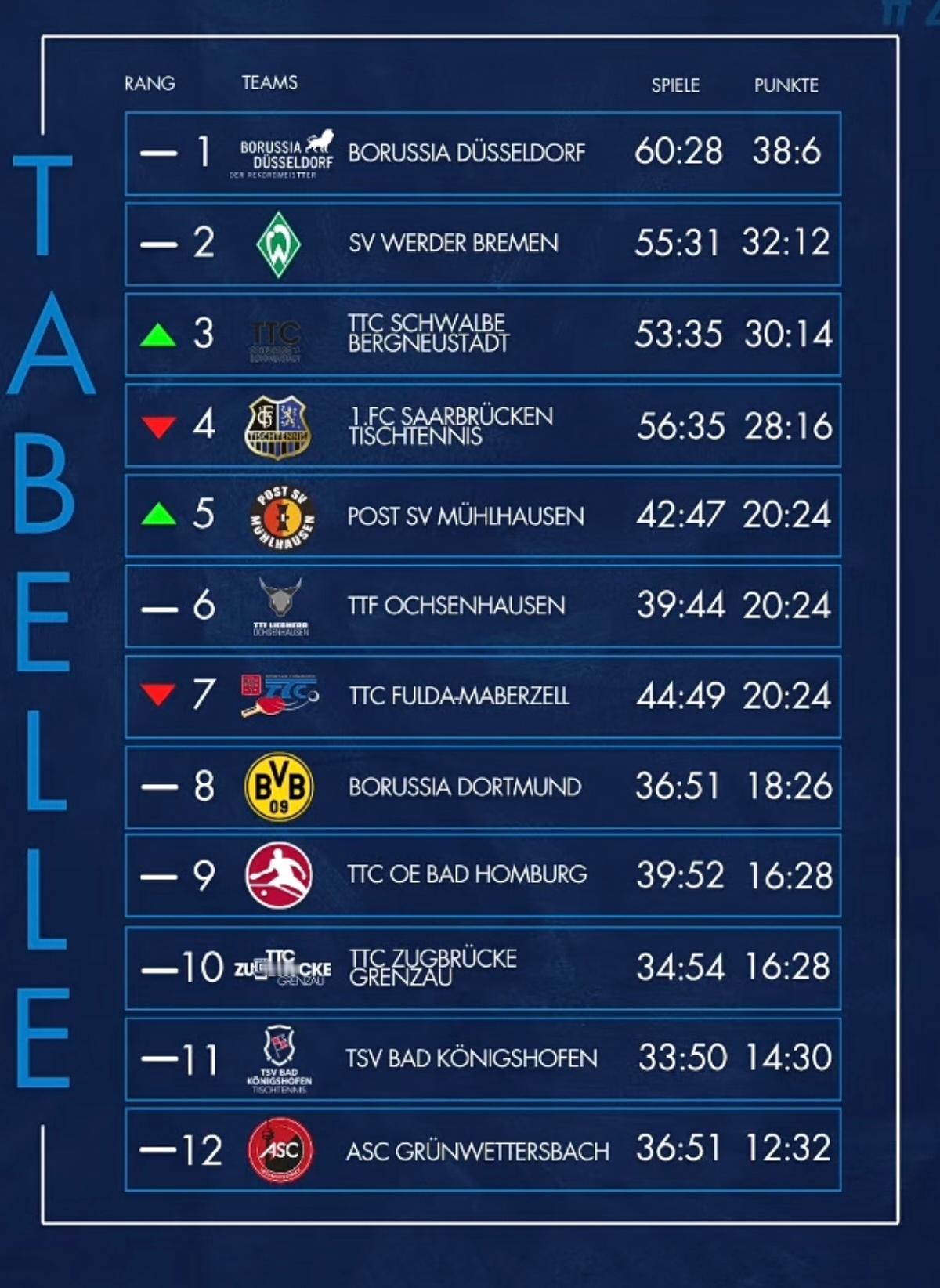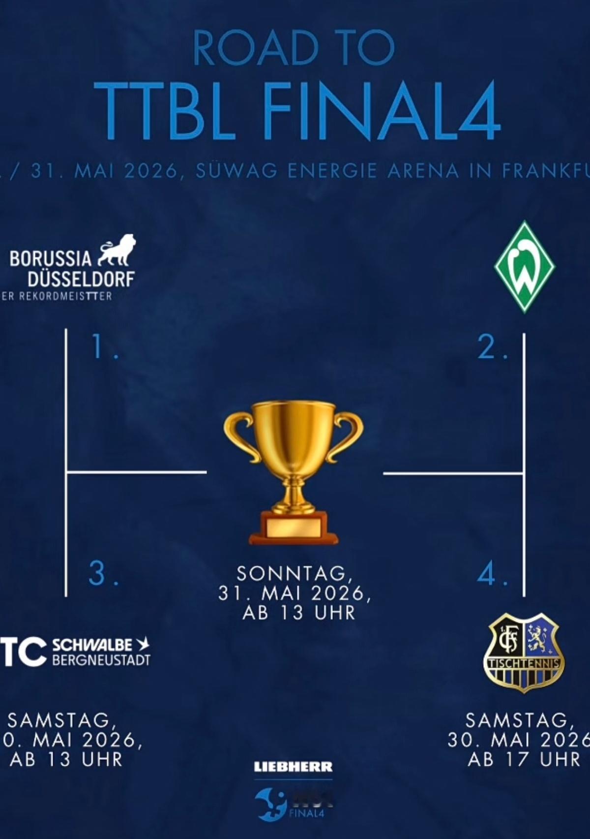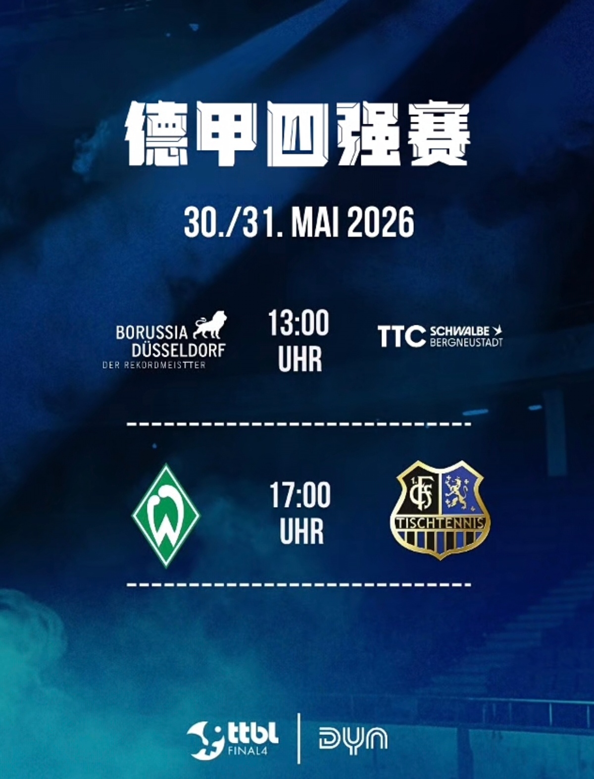 德国乒乓球联赛TTBL四强赛对阵表已出:5月30日[德国时间][北京时间+6]13:00起:杜塞尔多夫一贝格诺伊施塔特17:00起:不来梅一萨尔布吕肯5月31日13:00起:两场半决赛胜者会师决赛