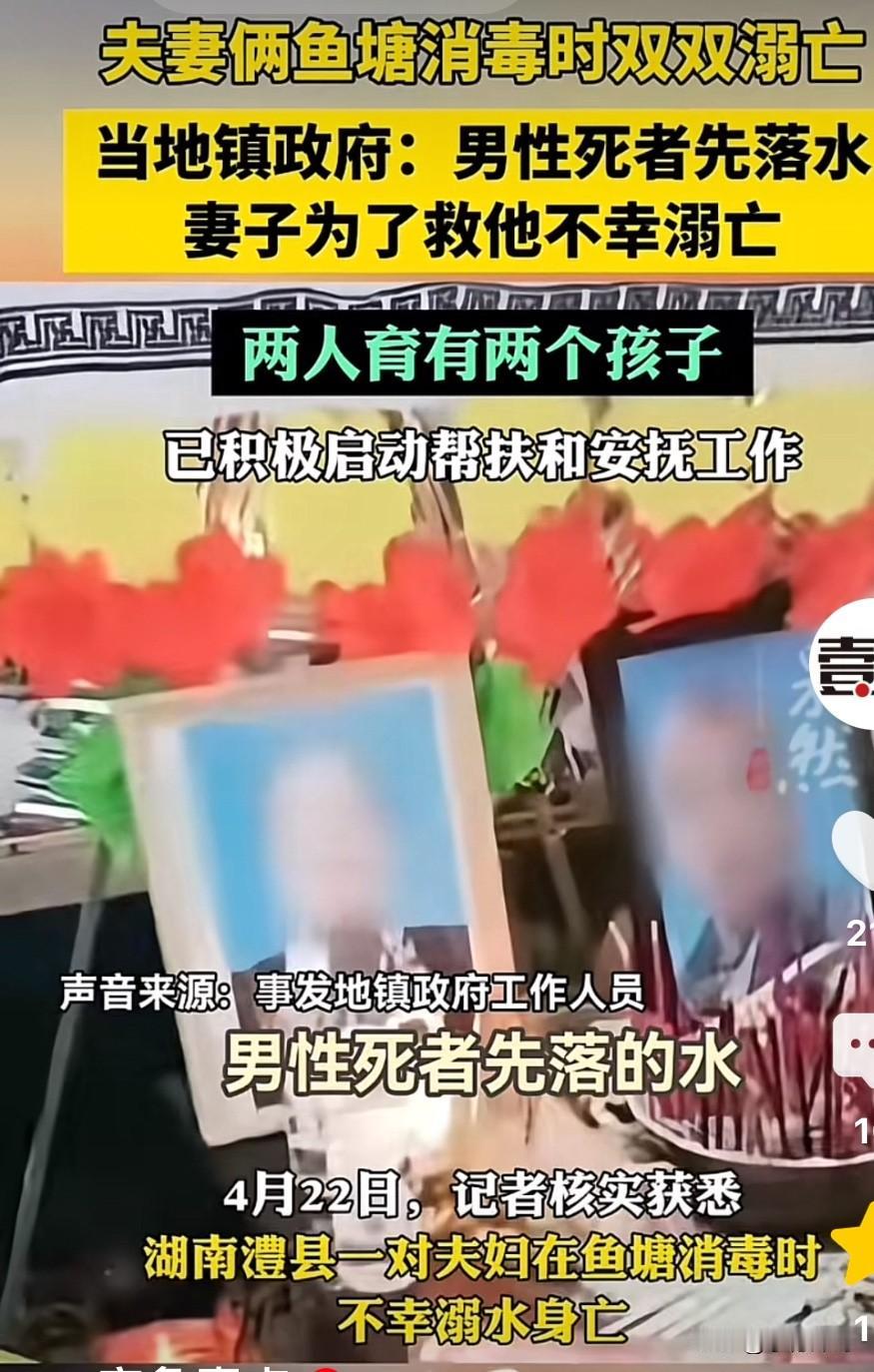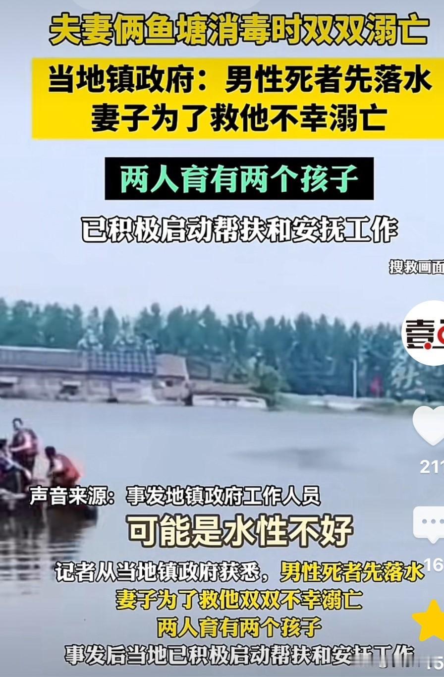 太不幸了!湖南澧县,夫妻二人给鱼塘消毒,丈夫落水后妻子为救丈夫也不幸落水,夫妻二人双双溺亡,留下两个未成年的孩子! 夫妻二人承包了当地一个鱼塘。这天夫妻俩划着简易小船给鱼塘消毒。 作业期间丈夫不慎落水,妻子想都没想就跳下去救人,结果两人都没能上来。留下两个孩子,一夜之间成了孤儿。 一个原本完整的家,就这样散了。 说句心里话,看到这种新闻,我首先想到的不是“这鱼塘多大”“损失多少钱”,而是一个最朴素的问题——为什么不穿救生衣? 我知道有人会说,农村干活哪有那么讲究,划个小船而已,又不是出远海。但正是这种“不讲究”,不知道毁了多少个家庭。 我能理解这对夫妻的不容易。养鱼是个辛苦活,起早贪黑,投喂、增氧、防病、消毒,哪样不得亲力亲为?雇人成本高,很多活只能自己干。为了省点钱、省点事,能凑合就凑合。一条小船,一个没穿救生衣的壮年汉子,谁能想到会出事? 但意外从来不跟你打招呼。 妻子看见丈夫落水,她本能地跳下去。这不是冲动,这是爱。可这份爱,最终没能救回丈夫,还搭上了自己的命。 如果当时岸边有救生圈、有长竹竿,如果有人懂得岸上施救的原则,结局会不会不一样? 说到底,这件事折射出的是农村生产安全意识的普遍缺失。多少农民朋友,日复一日地从事着高风险劳动,却连最基本的安全防护都没有。不是他们不怕死,而是总觉得“坏事轮不到我头上”。 可这一次,轮到他们了。 两个孩子的未来怎么办?谁来接送上学?谁来开家长会?谁在深夜给他们盖被子?这些问题的答案,让人不敢往下想。 说这些,不是为了消费悲剧。而是想提醒每一个正在看这篇文章的人: 无论你多忙、多累、多想省钱,请把安全放在第一位。开车系安全带,水上作业穿救生衣,高空作业系安全绳——这些看起来“麻烦”的小事,关键时刻能救命。 也请你把这篇文章转给你身边从事危险作业的亲人朋友。也许你的一个转发,就能让某个家庭避免一场灭顶之灾。 愿逝者安息,愿两个孩子能被这个世界温柔以待。