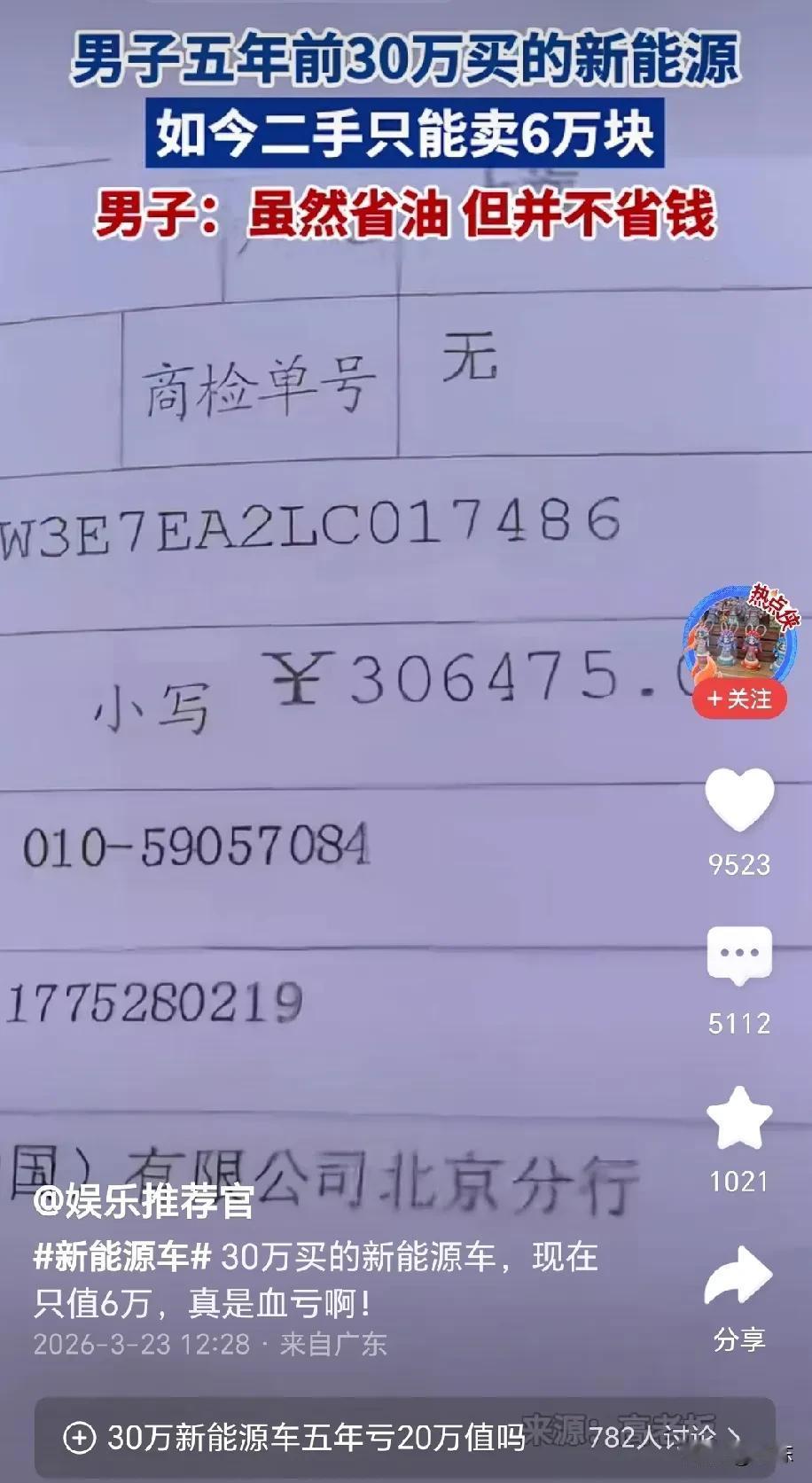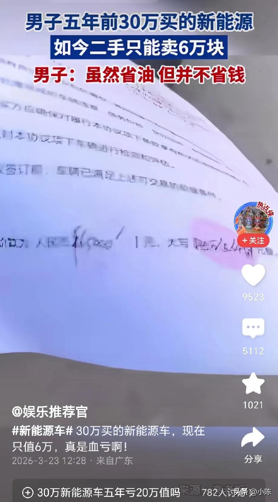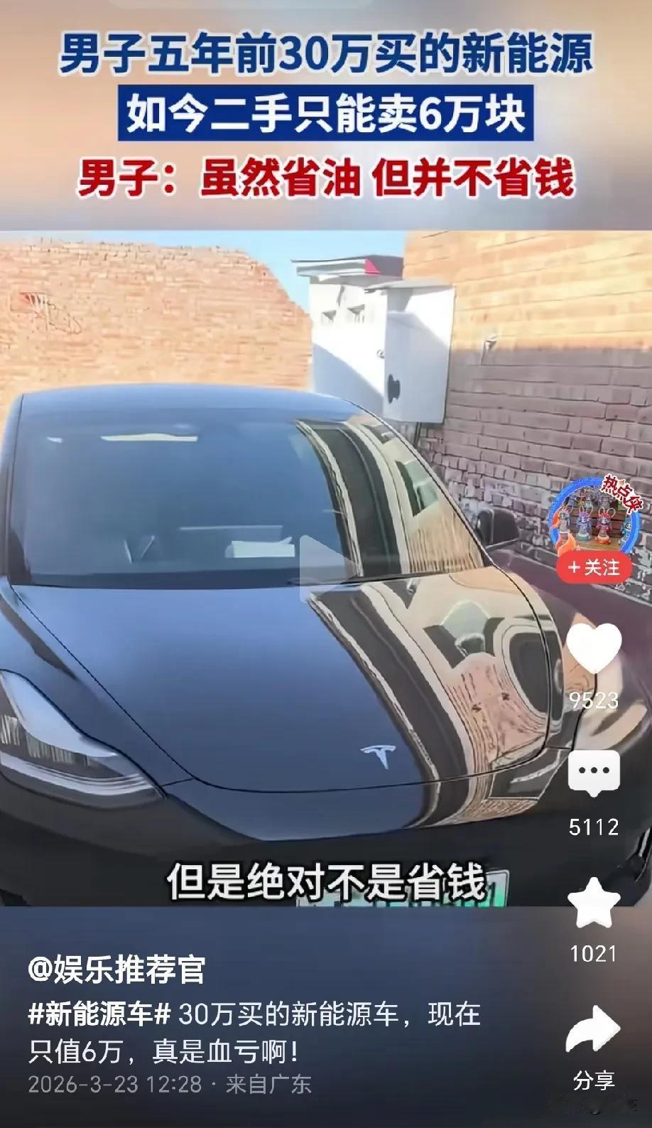 简直血亏呀! 男子5 年前花30 万买的新能源车,如今不想开了,当二手车卖,最终以6 万元的价格成交,算算账5 年赔了 20 万, 男子坦言:新能源车的确省油,但是并不省钱! 男子说:这辆车是2020年3月买的,买的时候花了30 万 6000,也就开了 5 年的时间, 现如今卖二手车,只卖了6 万 5000,短短5 年赔了20万,血亏! 其实,从我个人的观点看,用车频率不高的家庭,买台油车就足够了,用车频率高、路程近的家庭,开个电车更省油,而且利用率更高! 当然,只有普通家庭才会算这个账,那些不差钱的人家,必定是有油车也有电车,电车用于日常接送孩子,上下班,买菜等,油车用于长途旅行! 在这里,我想问一下各位,你们觉得是油车更划算?还是电车更划算?