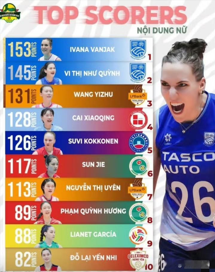 越南全国联赛第一阶段得分榜 1.伊万娜 153分 (前河南外援) 2.微氏如琼 145分 3.王艺竹 131分 4.蔡晓晴 128分 5.科克宁 126分 6. 孙杰 117分 PS:孙杰和车文涵应该还留在越南,将会代表通信兵团打雄王杯