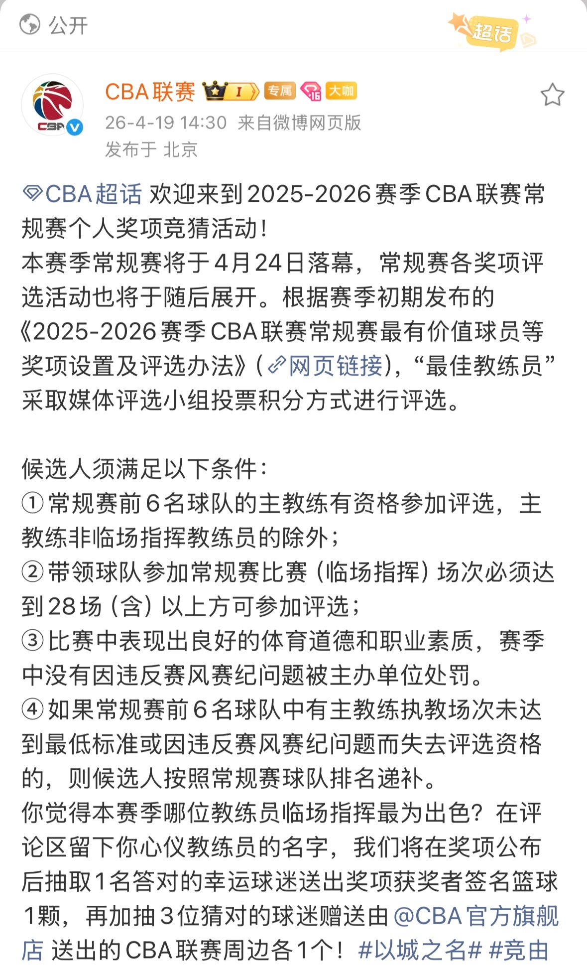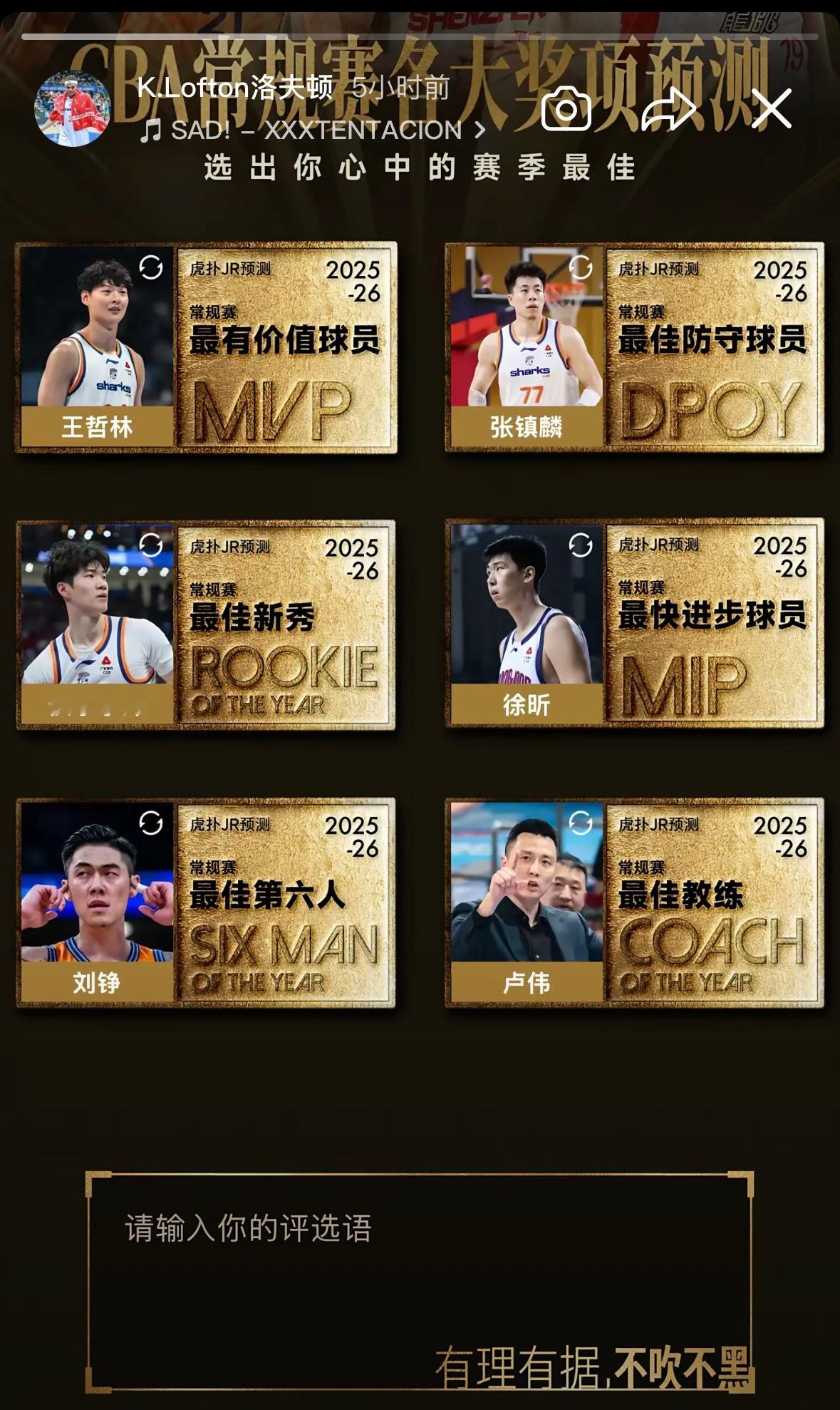 CBA常规赛收官在即,注意到洛夫顿社媒晒出了个人奖项评选预测,正好抽空听听大家的建议和喜好,球迷们也可以前往参加个人奖项的竞猜活动,选出你心目中的人选,还有机会获得签名奖品!