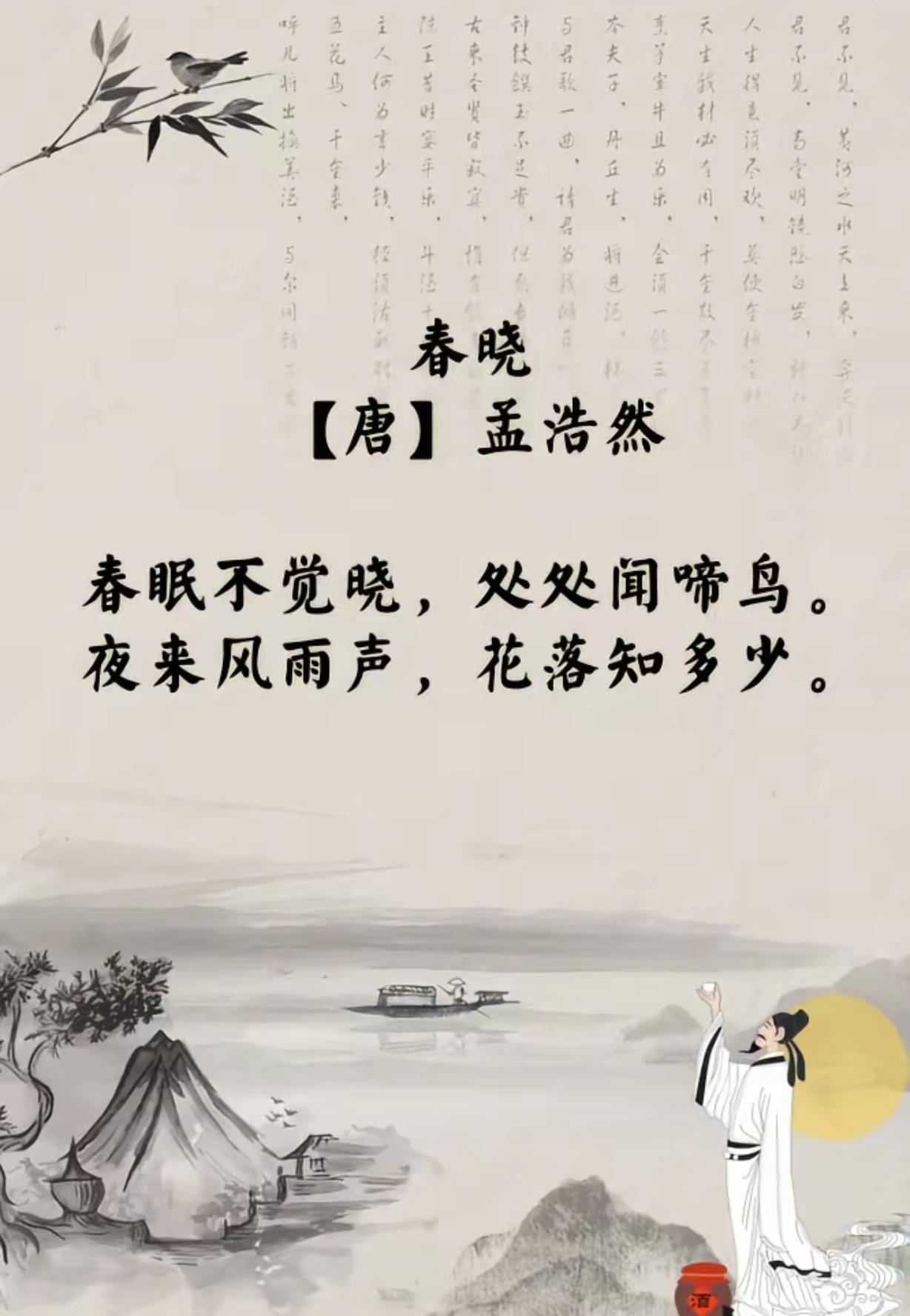 我想到的带“春”字的诗词是“春眠不觉晓,处处闻啼鸟”,出自孟浩然的《春晓》。这句诗特别有画面感,春天的早晨,诗人在甜美的睡梦中不知不觉就天亮了,醒来便听到窗外鸟儿欢快的啼鸣声。短短十个字,就勾勒出一幅生机勃勃的春日图景,把春日清晨那种闲适、惬意展现得淋漓尽致,让人读起来仿佛身临其境,感受到春天的美好和活力。而且语言简单易懂,却韵味十足,不愧是千古名句。