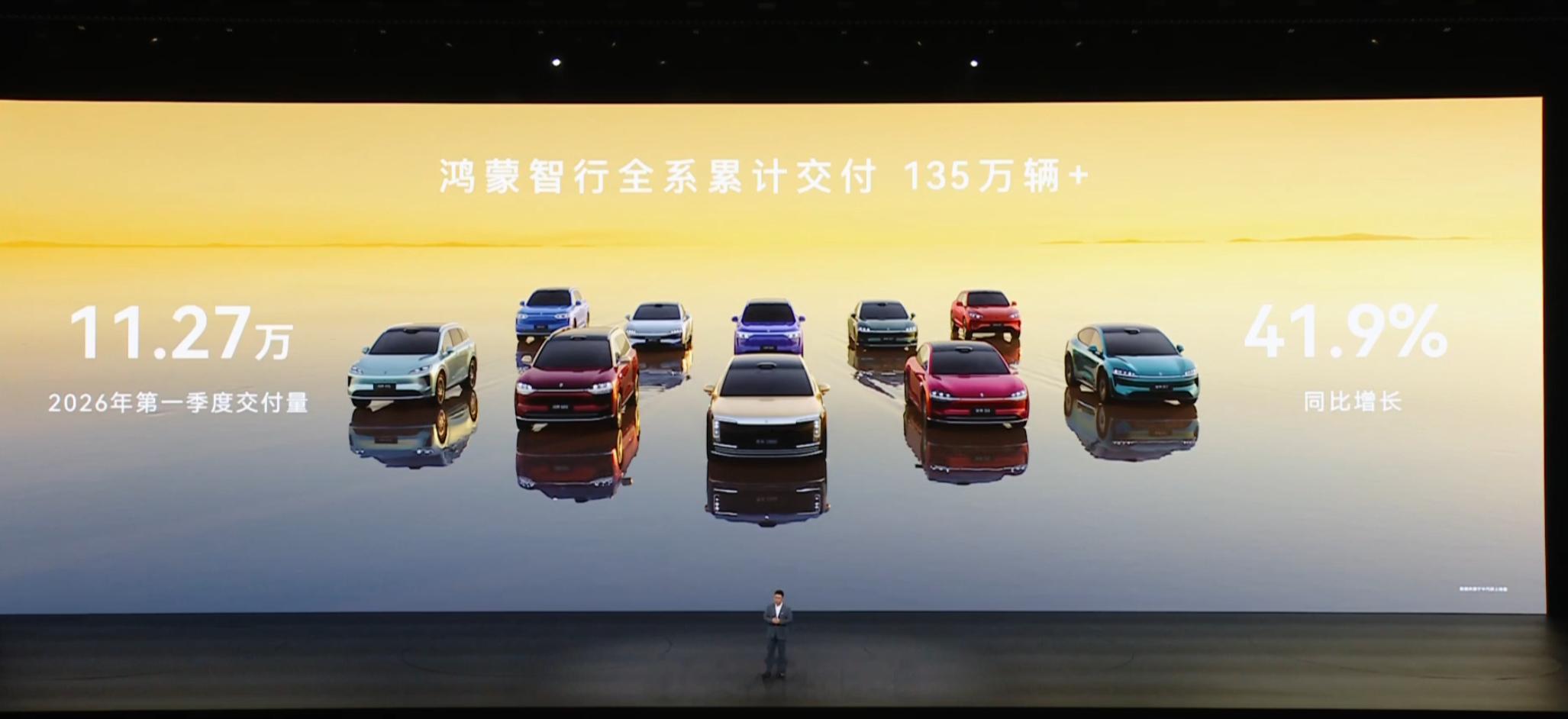 鸿蒙智行全系累计交付已经突破 135 万辆,2026 年第一季度交付量 11.27 万,同比增长 41.9%。