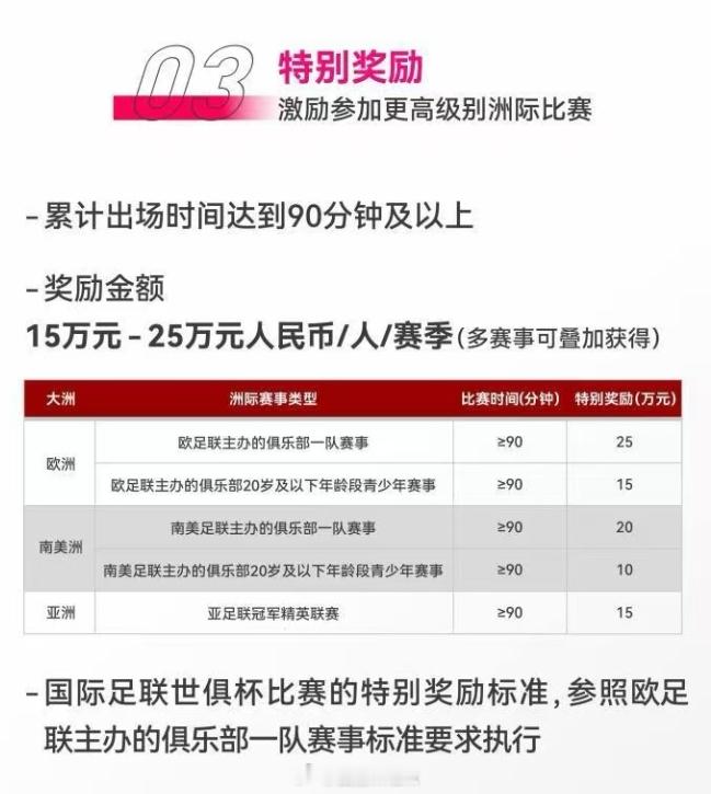 4.特别奖励是鼓励球员打高水平赛事的,欧冠出场90分钟以上就是25万,青年欧冠是15万,南美解放者杯和南球杯是20万,青年赛事10万,亚冠15万。