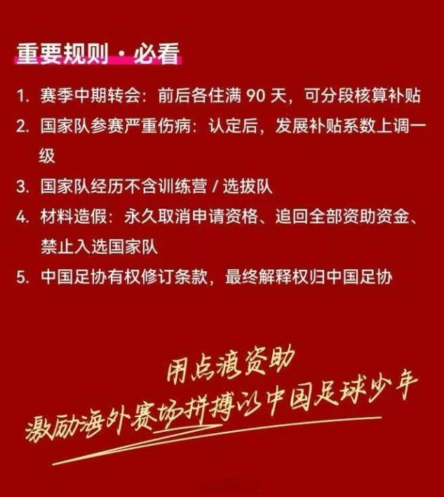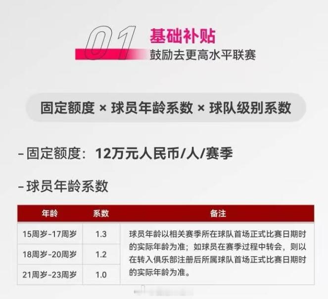 2.基础补贴是按12万乘以系数算的,最高的比如16岁踢英超:12x1.3x6=93.6万人民币/赛季,如果20岁以后踢上英超,就是12x1.0x6=72万元/赛季,现实点踢葡超、荷甲、比甲是12x1.0x4=48万元/赛季。