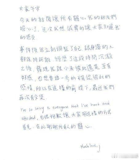 吴卓源承认与朱轩洋复合 22日,吴卓源发布手写信,承认与朱轩洋复合。她表示两人仍互有好感,希望确认感情,近期已重新有了往来。此前两人曾在公园被拍亲密画面,近日又被拍到朱轩洋前往吴卓源家中过夜。