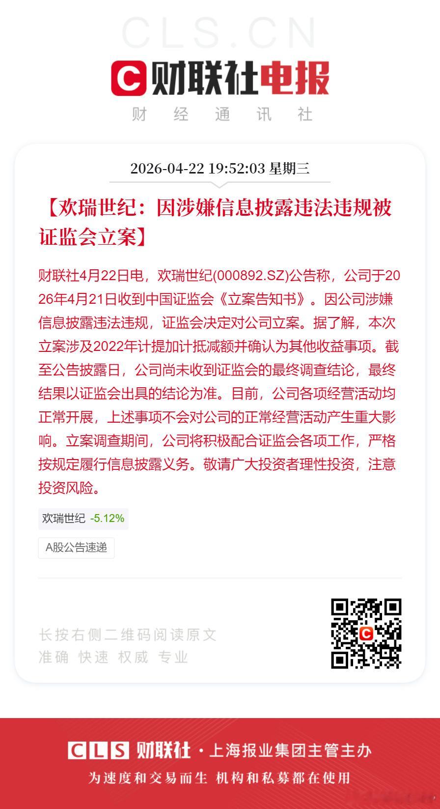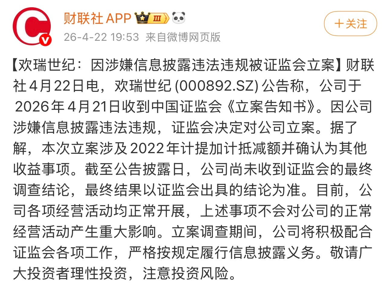 财联社:欢瑞世纪因涉嫌信息披露违法违规被证监会立案