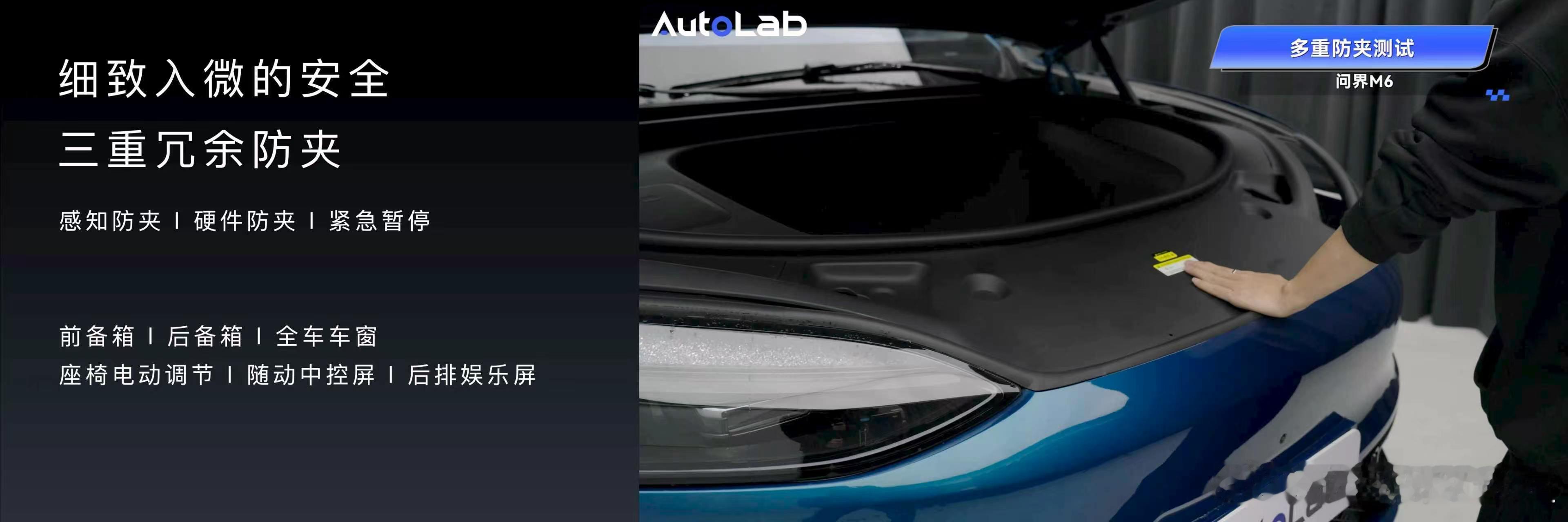 鸿蒙智行发布会 问界M6采用超五星安全架构设计,十一横十一纵硬核车身,高强度车身材料占比83.62%,乘员舱热成型材料占比44.76%,全车16处采用2000MPa热成型钢材料。全新一体化加强门环,门框强度提升15%,创新双C环车身结构使扭转刚度提升133%。前备箱、后备箱、智能迎宾踏板、座椅电动调节、随动中控屏、后排娱乐屏均设有感知防夹、硬件防夹、紧急暂停三重冗余防夹机制,实现细致入微的安全。问界M6动态评测首发