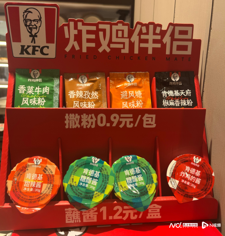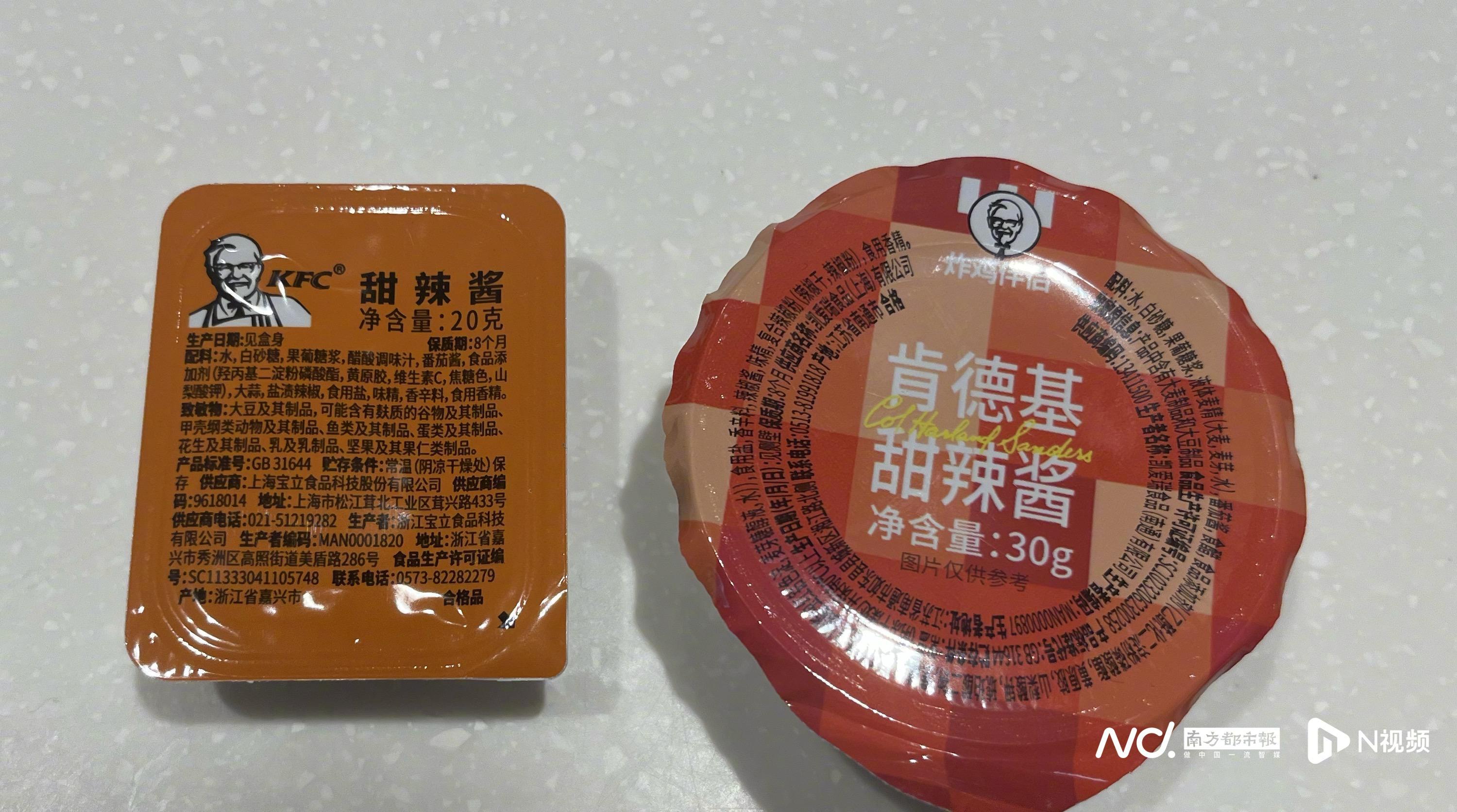 4月22日,南都·湾财社记者走访广州多家肯德基餐厅发现,此次收费的7款调味品包括撒粉和蘸酱,相比于传统蘸酱(糖醋酱和甜辣酱),上新蘸酱在规格、配料成分和供应商均存在差异。消费者较为关注的番茄酱则不在此次收费的调味品品类中。