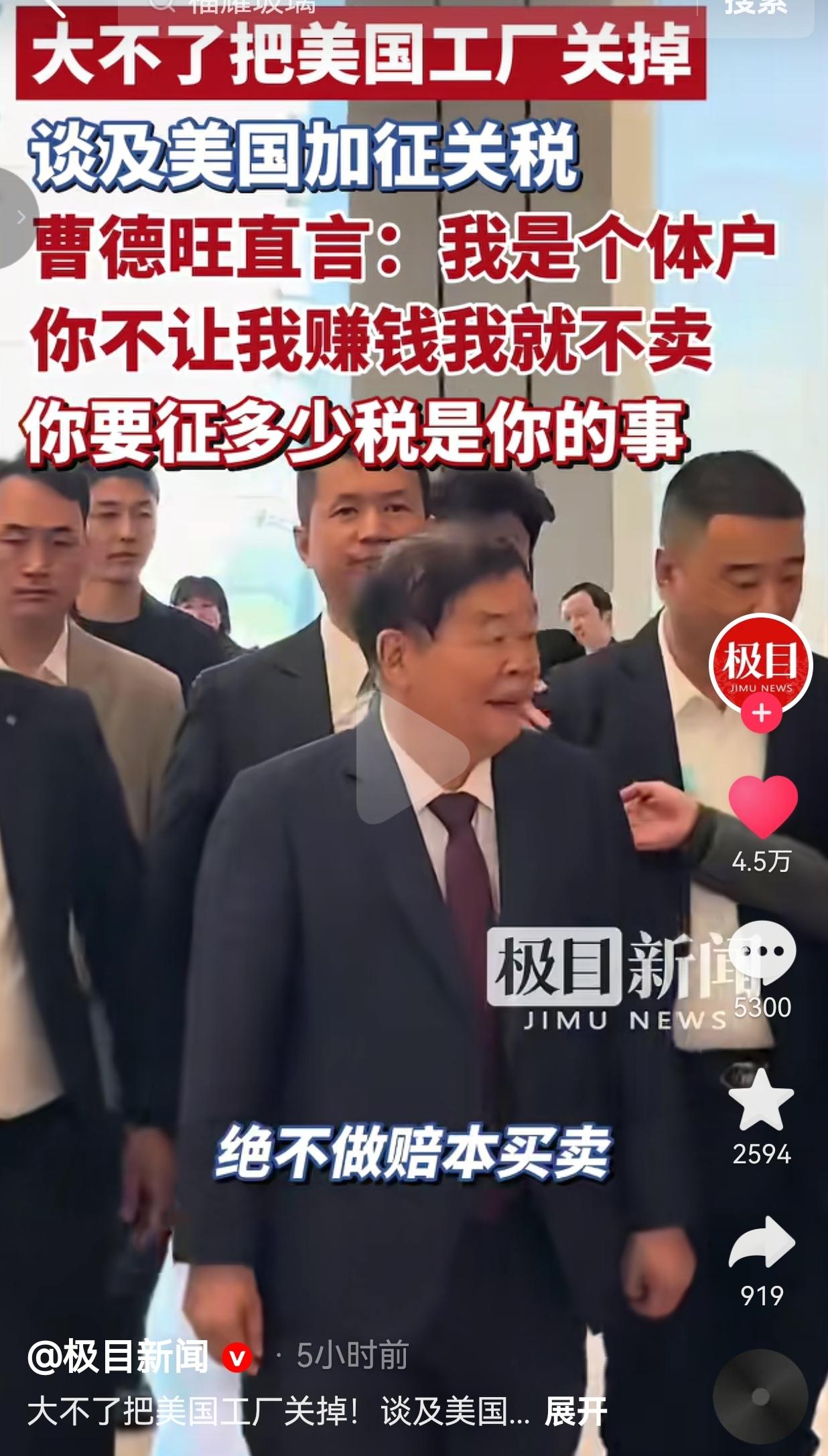 曹德旺:大不了关掉美国工厂!中国企业家的硬气,太解气了 在别人还在琢磨怎么在关税夹缝里求生存的时候,曹德旺一句话把态度甩得明明白白:我不陪你玩了。 4月21日福耀玻璃的年度股东会上,有投资者问了个所有人都关心的问题:美国那边要是一直加关税,公司打算怎么办? 79岁的曹德旺坐在台上,没打官腔,也没绕弯子,张口就是一句:“我是个体户,你不让我赚钱我就不卖。你要征多少税是你的事。” 紧接着他补了句狠话,直接把全场镇住:“如果遇到不讲道理的情况,大不了我就把(美国)工厂关掉,绝不做赔本买卖。” 就这两句话,没有任何修饰,却比所有精心打磨的公关稿都更有力量。 谁都知道,福耀在美国的工厂投了几十亿,养活了上千个当地工人,也帮美国车企解决了玻璃供应的大问题。 换别人,可能早就忙着想怎么妥协、怎么找补、怎么求个“留条活路”了。 但曹德旺偏偏不这样做。 他算得比谁都清楚:做生意不是当冤大头,更不是忍着委屈求生存。你加税让我赚不到钱,那我就不卖给你,工厂关了又怎么样?我福耀不靠你这碗饭活。 这话听着硬,其实全是底气。 这么多年,福耀靠的不是对谁的依附,是实打实的技术和成本控制,是能在全球市场站稳脚跟的硬实力。 他敢说“不陪你玩了”,是因为他知道,离了美国市场,福耀照样能活下去;反倒是美国车企,想找个能替代福耀的玻璃供应商,没那么容易。 网友看到后评论说:“这才叫中国企业家的骨气!不是谁都敢在海外这么硬气的。” 也有的网友说:“我开小超市的,遇到压价到没利润还挑事的客户,我直接不卖,大不了少赚点,也不憋屈自己。” 还有的网友说:“话是硬气,但美国工厂真关了,国内工人和供应链不受影响吗?” 更有网友表示:“别扯什么大局,做生意的底线就是不赔本,曹德旺把这个理说透了。” 说真的,我看完这段视频,心里特别痛快。 这些年我们也见过不少企业,为了海外市场忍气吞声,什么委屈都受,什么条件都答应,最后钱没赚到多少,腰杆却弯得直不起来。 可曹德旺不一样,他从始至终都把“我是个体户”挂在嘴边,说自己就是个做买卖的,不赚亏心钱,也不做赔本的买卖。 这句话听着朴素,其实藏着最清醒的商业逻辑:企业的底线是盈利,更是尊严。 你可以跟我谈合作,谈规则,谈公平竞争,但你不能拿着关税大棒逼着我亏本做生意,更不能不讲道理、随意拿捏。 曹德旺的底气,从来不是来自谁的施舍,而是来自自己手里的技术、工厂,还有几十年来攒下的口碑和实力。 他比谁都清楚,真正的尊重不是靠妥协换来的,是靠你自己硬气的腰杆和不可替代的价值。 就像他说的,大不了关掉美国工厂,福耀还是那个福耀,照样能把玻璃卖到全世界。反倒是那些习惯了搞单边限制的一方,少了福耀,他们的日子未必好过。 做生意和做人一样,你越硬气,别人越不敢随便拿捏你;你越妥协,别人越得寸进尺。 曹德旺这两句话,不是赌气,是清醒,是一个中国企业家刻在骨子里的硬气。 做生意要有底线,做人要有骨气。不赚亏心钱,不丢中国脸。
