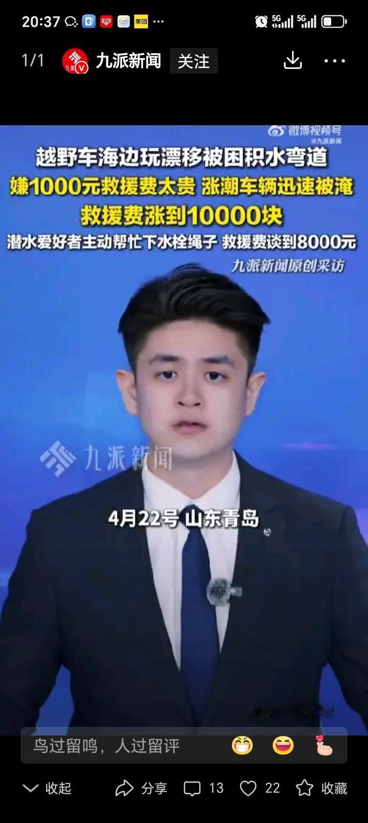 嫌1千太贵车被淹后花8千救出 4月22日报道,山东青岛。越野车海边漂移遇涨潮被淹,嫌1000元救援费太贵最后花了8000元。目击者李先生告诉九派新闻,车主贸然驶入积水弯道被困,找来铲车救援,因1000元救援费协商未果,仅几秒钟,潮水快速上涨,全车被泡。 嫌1千太贵车被淹后花8千救出,这样的故事你听过吗?4月22日,山东青岛的这起事件迅速引发网友热议:一位越野车主为了省下1000元的救援费,结果却因犹豫和错误判断,最终花了8倍的代价将车子从涨潮的海水中“抢救”出来。这个看似荒唐的经历,背后其实映射了我们每个人在面对风险和选择时的心理博弈,以及对“省钱”与“安全”之间天平的摇摆。 事情的经过很简单:车主驾驶越野车进入海边积水弯道,遇上涨潮被困。现场目击者李先生透露,当时救援人员开出1000元的费用,车主觉得贵,迟迟不肯同意。就在这短短几秒钟内,潮水迅速上涨,整辆车被淹没。最终,车主不得不花费8000元请来铲车救援,代价惨重。 这件事让人忍不住反思:在生活中,我们是不是也常常因为一时的“省钱”心理,反而让问题变得更糟?“1000元太贵,我能自己想办法。”这句话听起来很合理,但当风险来临时,拖延和犹豫往往带来的是更大的损失。就像这位车主,原本1000元的救援费,换来了8000元的高额救援费用,甚至可能还有更严重的后果。 更深层次地,这反映了人们对风险认知的盲区。我们总以为自己能够掌控局面,能够“硬扛”过去,却忽视了自然的力量和不可控因素的威胁。正如涨潮的海水,来得快且凶猛,一旦错过最佳救援时机,后果不堪设想。 这起事件不仅是一个教训,更是一面镜子,映照出我们在生活中面对选择时的心理挣扎。你是否也曾因为觉得某件事“太贵”而犹豫不决,结果反而付出了更大代价?或者你有没有类似的经历,想要分享和吐槽? 欢迎大家在评论区留言,告诉我们你的故事和看法。让这起“嫌贵花大钱”的奇葩事件,成为我们共同的警示:有些“省钱”,其实是最贵的浪费!安全和及时的选择,才是明智之举。越野车海边被淹 救援价格 因小亏大的越野车车主 失算的越野车车主